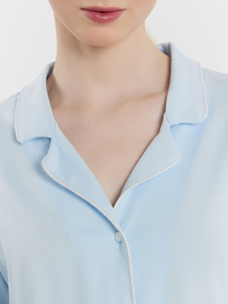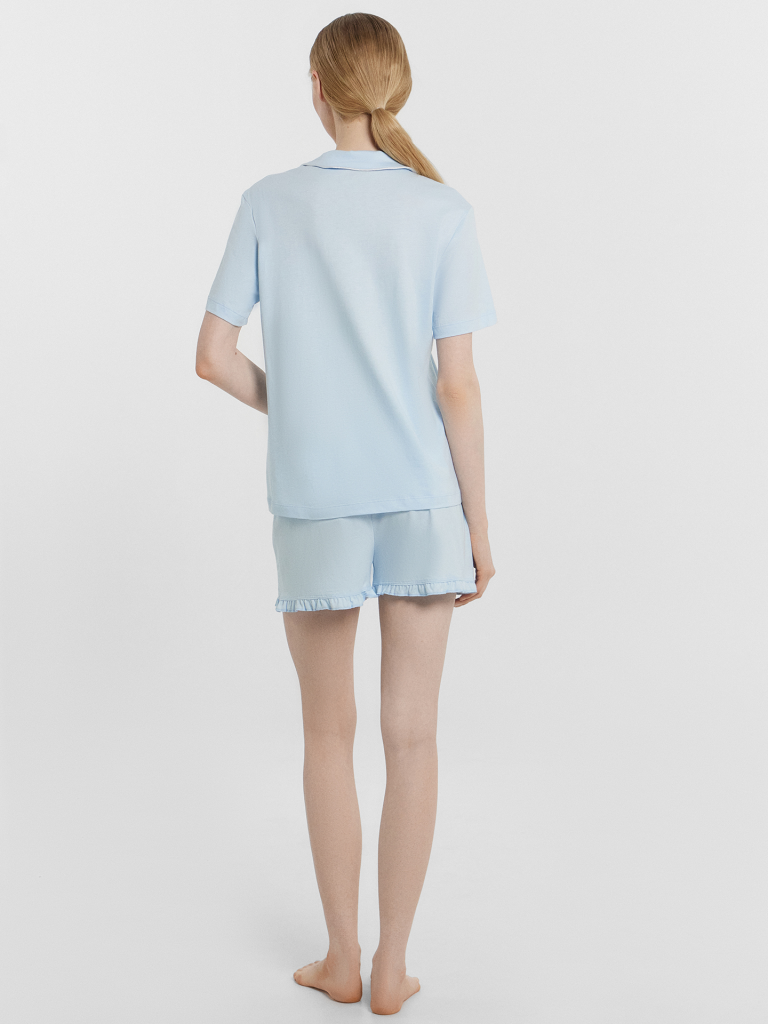 Красивая пижама женская из высококачественного хлопка актуального свободного силуэта, модель выполнена в однотонном цвете с рисунком в виде горошка. Горловина жакета оформлена отложным воротником с лацканами. По краю воротника атласный кант. Рукав короткий. Жакет с центральной застежкой с петлями и пуговицами. Шорты свободного силуэта, низ шорт обработан с отрезными рюшами. В ней абсолютно не жарко, комфортная легкая слегка тянущаяся ткань не сковывает движений. Красивая и интересная модель на каждый день. В линейке много цветов и широкий размерный ряд. Такая пижама женская отлично подойдет для сна и домашних дел. Если вы в поиске нескучного комплекта, модель вас однозначно порадует. Выглядеть стильно и модно дома - это реально. Купите пижаму женскую от Mark Formelle для уютных вечеров и сладких снов!