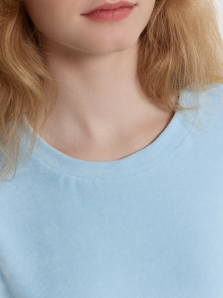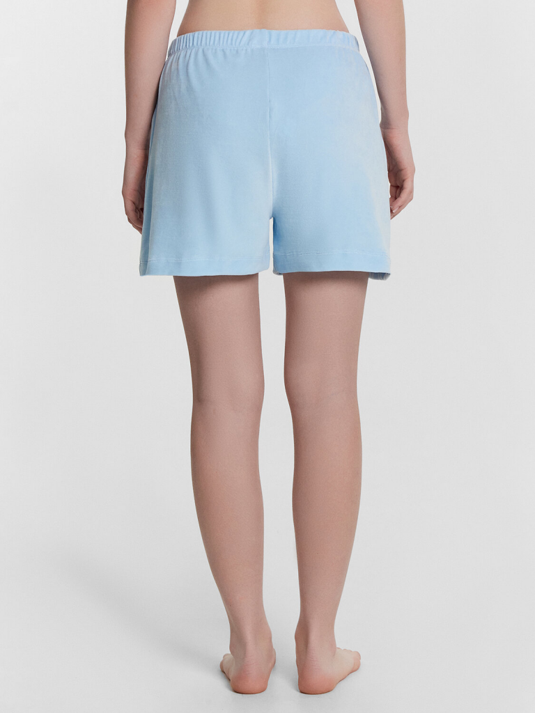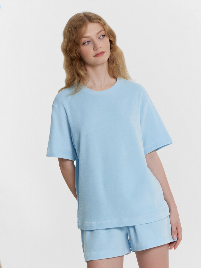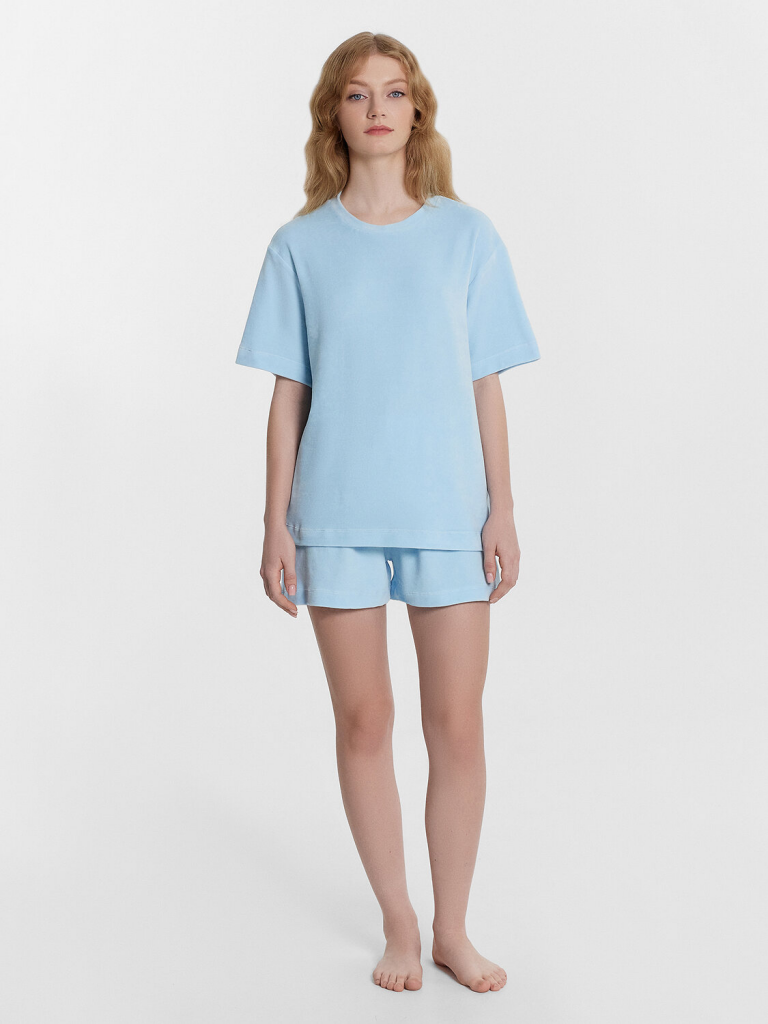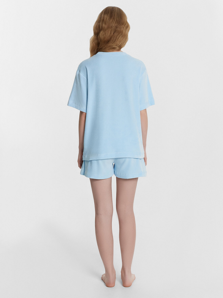 Комплект состоит из джемпера и шорт. Джемпер свободного силуэта. Горловина обработана обтачкой из основного полотна. Рукава втачные короткие, плечо спущено. Низ изделия и рукава обработан в подгибку. Шорты свободного силуэта, короткие. Пояс цельнокроеный, с втаченной эластичной тесьмой (вн. 30мм 30RV). Низ шорт обработан швом в подгибку.