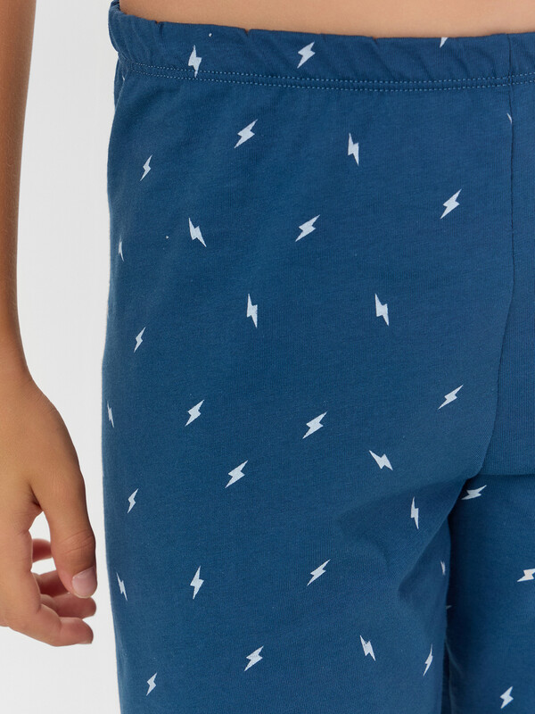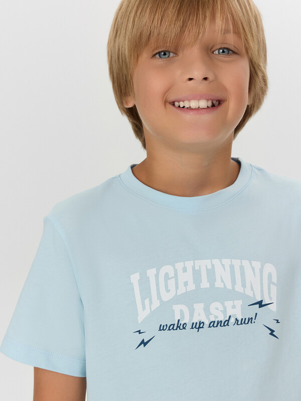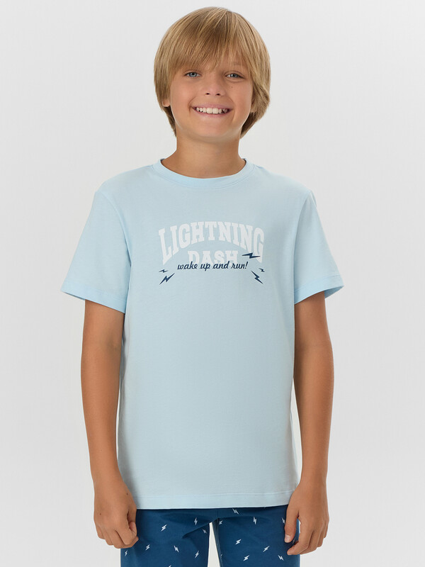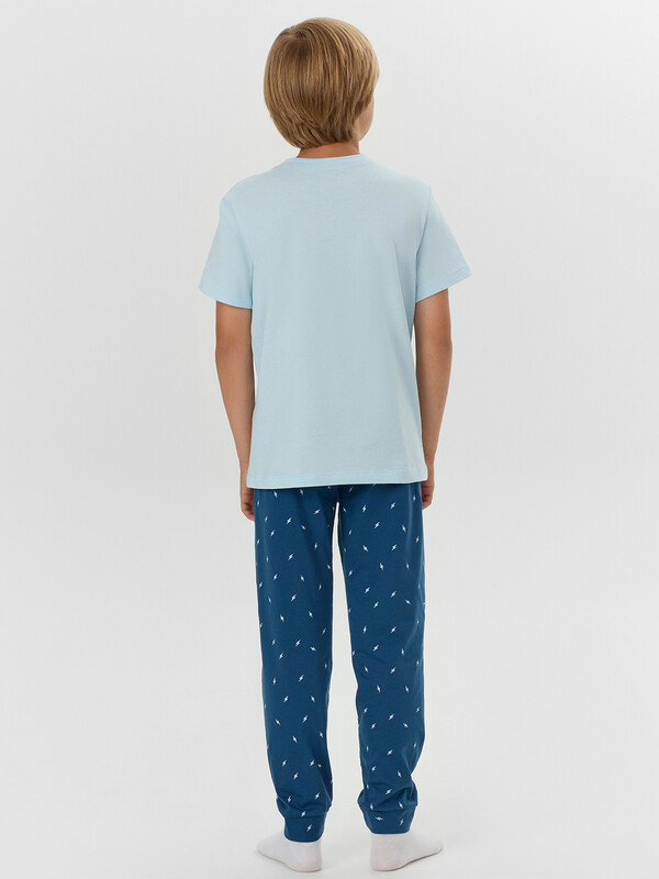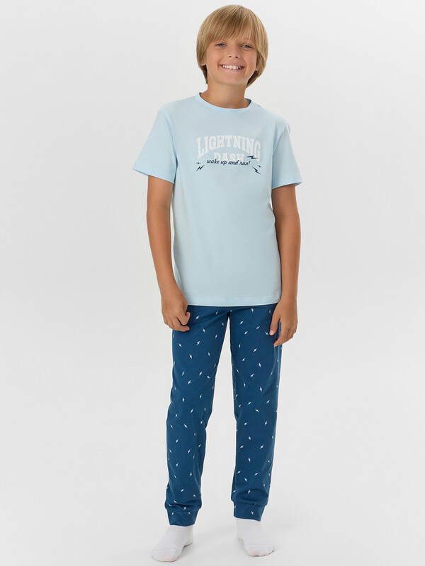 Пижама для мальчика голубая с надписью "Молниеносный рывок. Проснись и беги" — это стильный и комфортный комплект для активного отдыха и сладкого сна. Набор состоит из футболки с коротким рукавом и брюк с эластичным поясом и манжетами, выполненных из высококачественного хлопка. Натуральный материал обеспечивает идеальную воздухопроницаемость и мягкость, делая эту пижаму подходящей для любого сезона. Эластичная ткань не сковывает движений, позволяя ребенку играть, отдыхать и спать без дискомфорта.