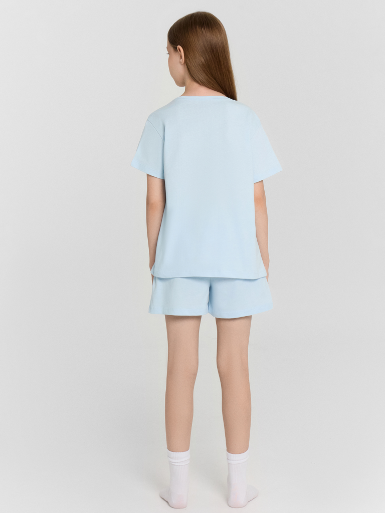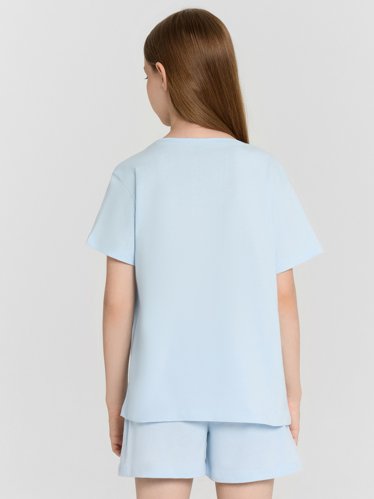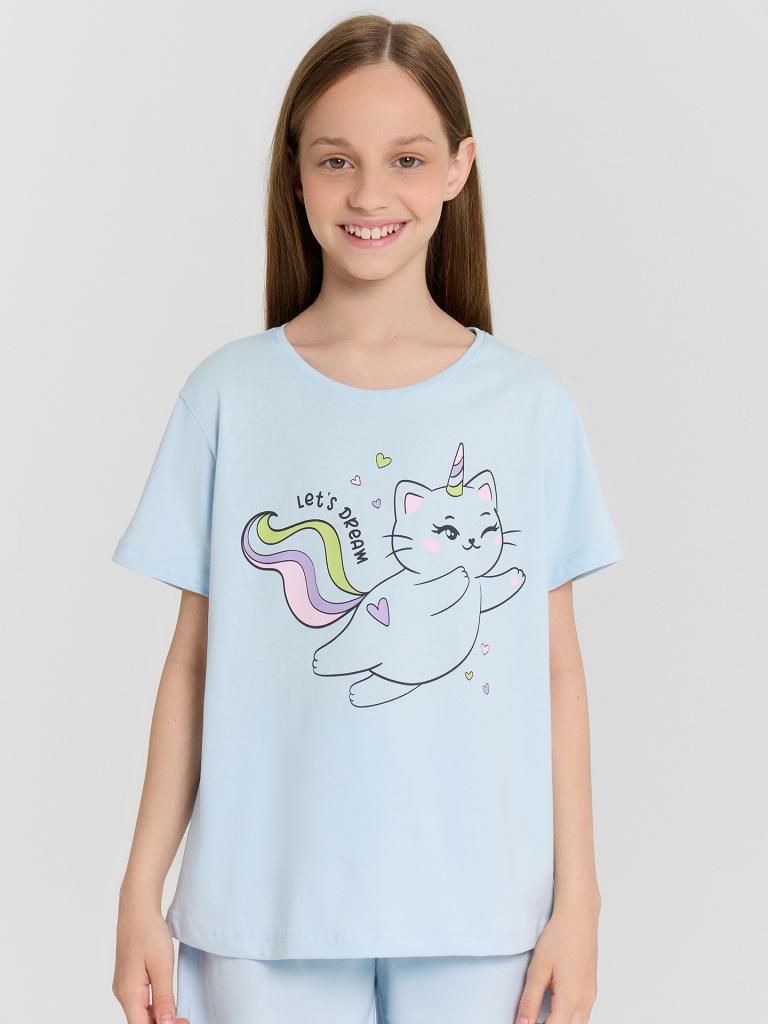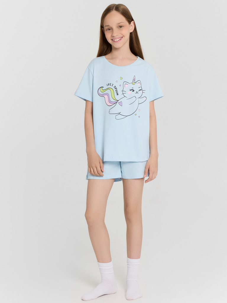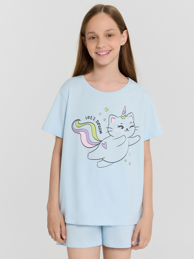 Комплект для девочки, состоит из футболки с короткими рукавами и шорт из натурального хлопка. Подходит для сна и отдыха. Материал очень приятный к телу, хорошо пропускает воздух, что позволяет чувствовать себя комфортно даже в жаркую погоду. Идеальный выбор детской одежды для дома. Стильно, красиво, комфортно. Футболка декорирована интересным принтом, шортики однотонные. Широкий размерный ряд, базовые и яркие расцветки, модели с принтами, рисунками и печатями. Купите детскую пижаму для девочки от Mark Formelle, порадуйте ребенка красивым и стильным подарком!