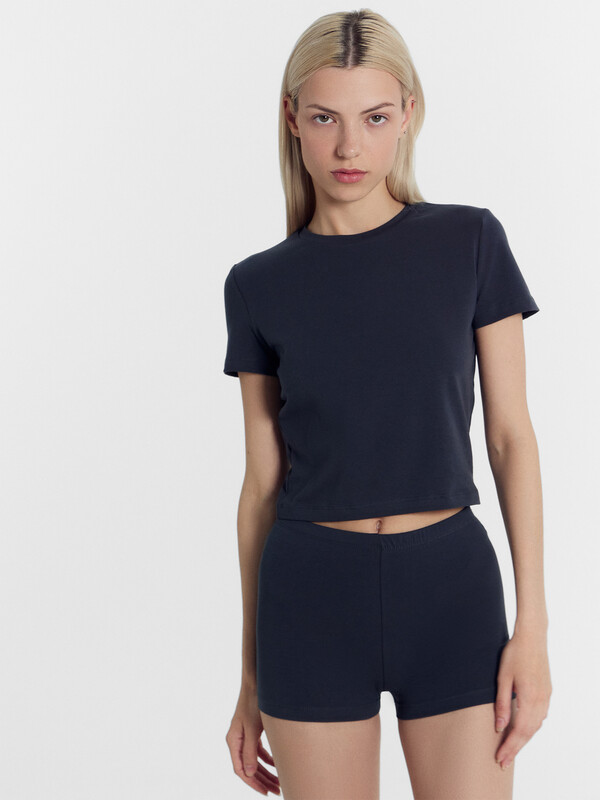 Комплект женский состоит из футболки и шорт. Футболка укороченная, прилегающего силуэта. Перед и спинка цельнокроенные. Горловина округлой формы окантована бейкой из основного полотна. Рукав втачной, короткий. Низ футболки и шорт обработан швом в подгибку.