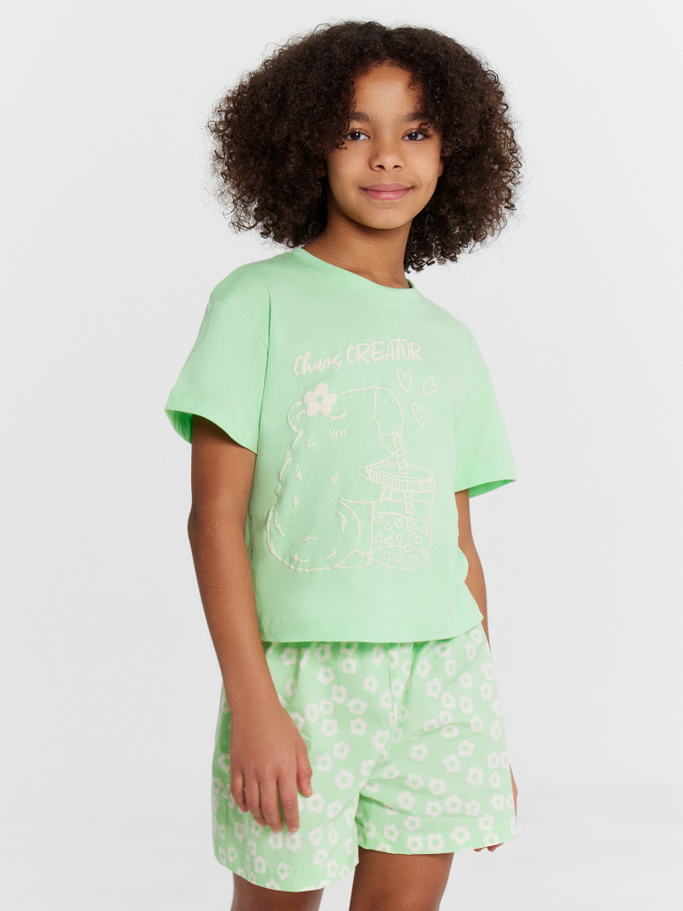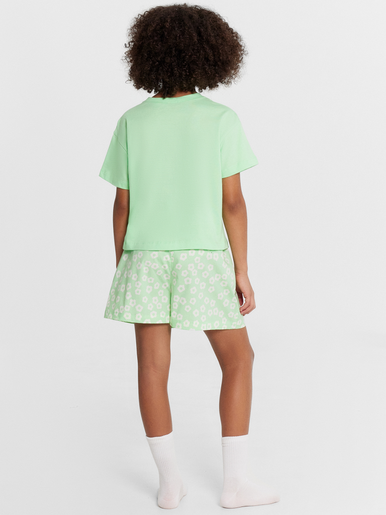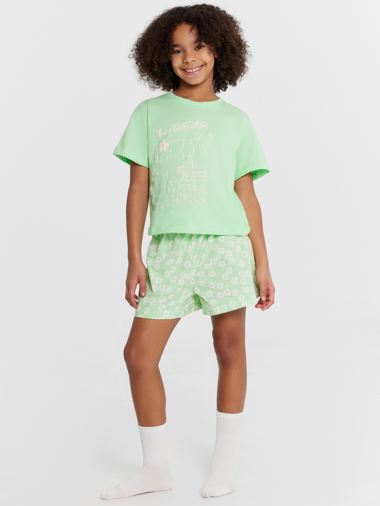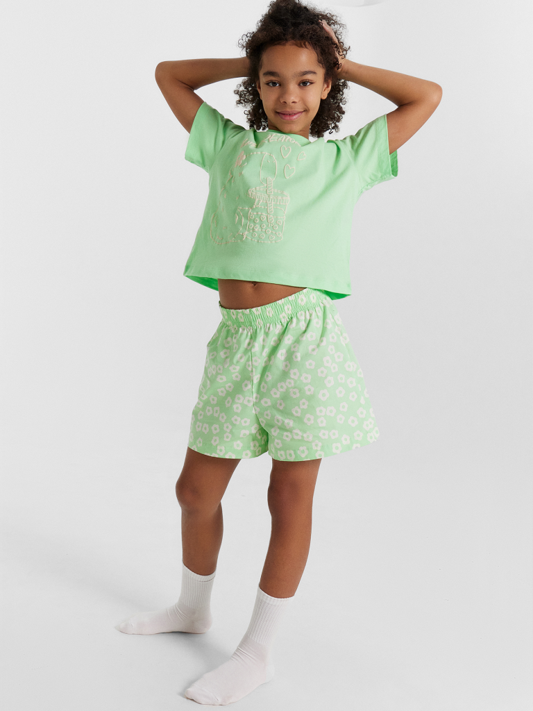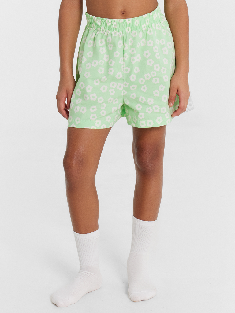 Шорты свободного силуэта. Пояс цельнокроеный внутри с резиной. Низ шорт в подгибку.