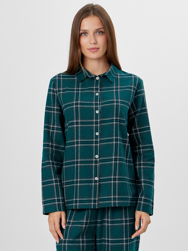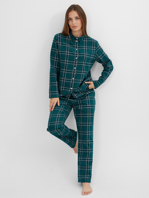Пижама женская домашняя в клетку — это уют и гармония для вашего отдыха. Набор из рубашки и брюк выполнен из хлопка, который дарит коже нежность, воздух и комфорт. Свободный силуэт рубашки с заниженной линией плеч и длинными рукавами не сковывает движений, а застежка на пуговицы добавляет классическую элегантность.