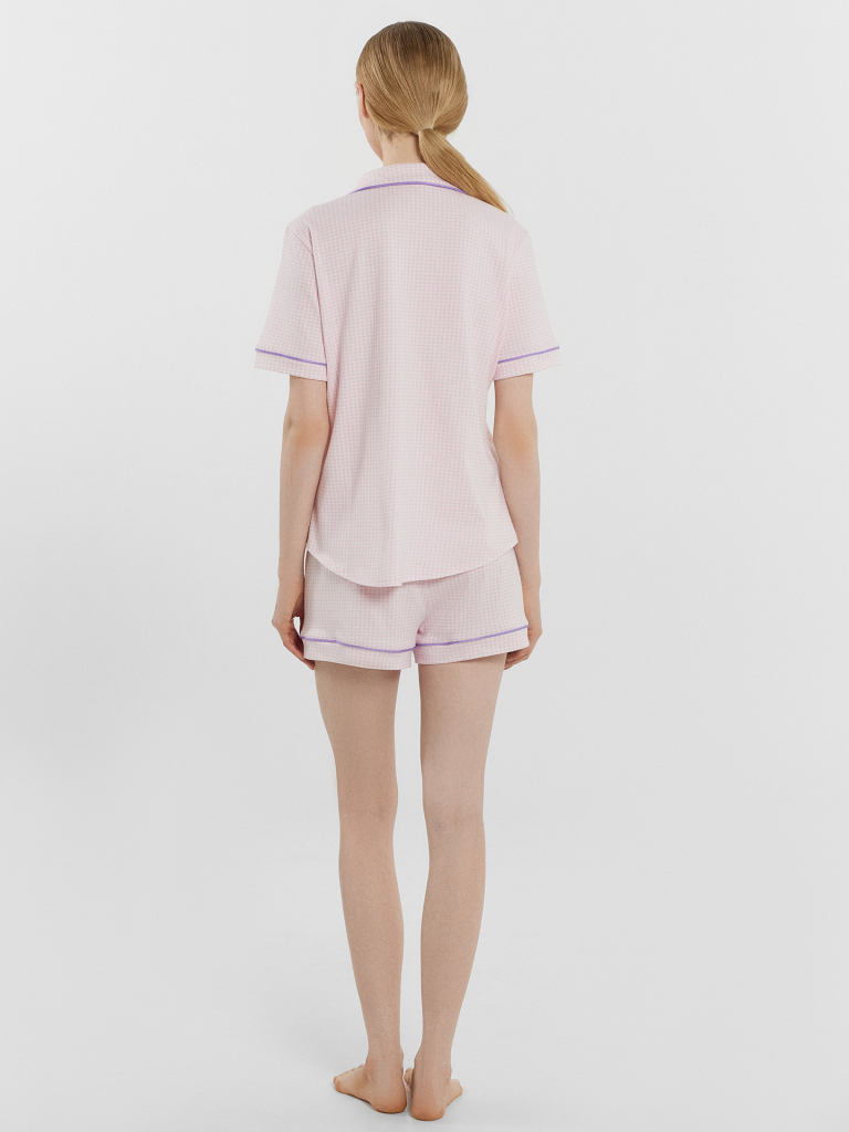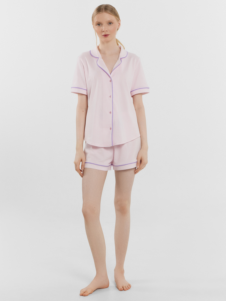 Женская хлопковая пижама свободного силуэта – идеальный выбор для комфортного и стильного отдыха. Рубашка прямого кроя с отложным воротником и лацканами, короткими рукавами и застежкой на пуговицы добавляет элегантности и удобства. Свободные шорты длины мини с эластичным поясом и атласной тесьмой, завязывающейся на бантик, обеспечивают дополнительный комфорт и очарование. Особенностью этой модели являются контрастные канты на рукавах, воротнике и передней части рубашки, что придает ей стильный и утонченный вид. Эта пижама станет отличным вариантом для сна, отдыха и выполнения домашних дел, даря вам комфорт и красоту в каждом моменте. Рекомендуем эту милую модель для самых любимых!