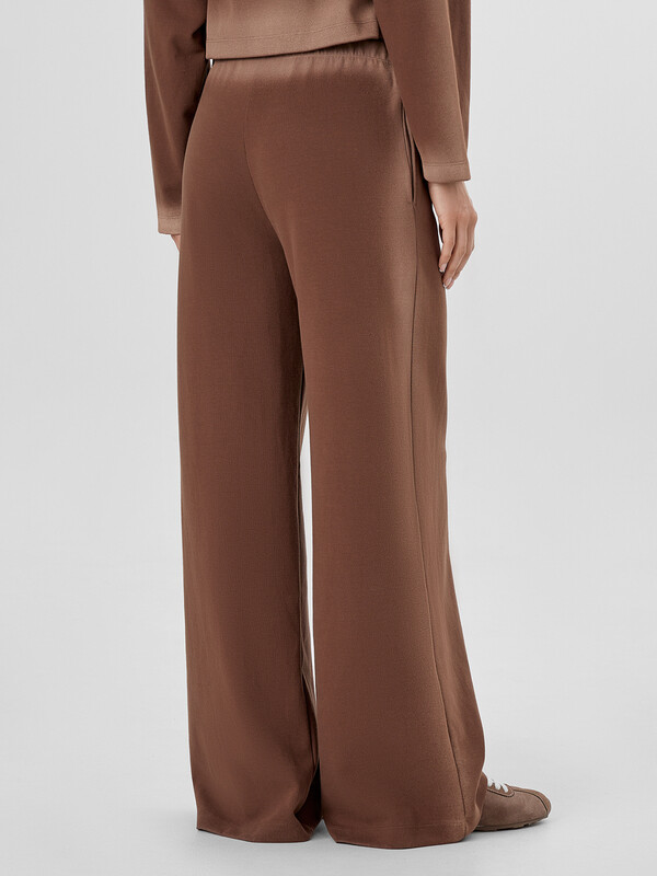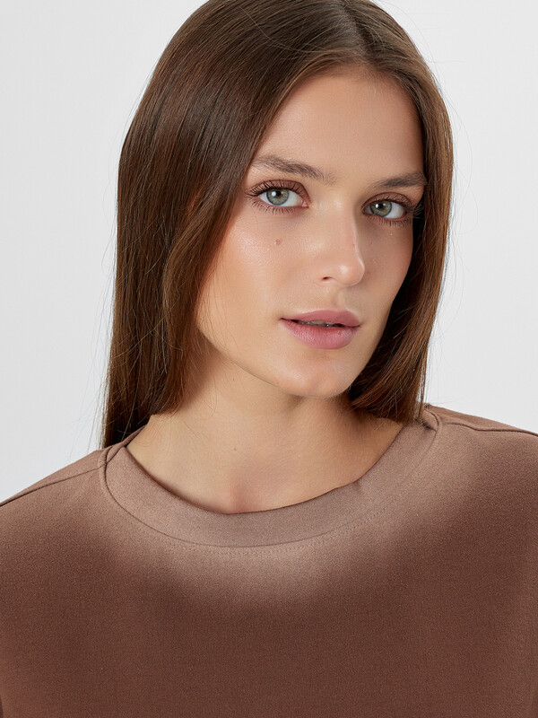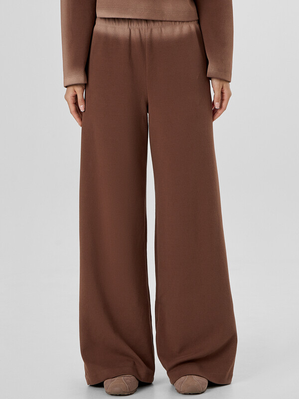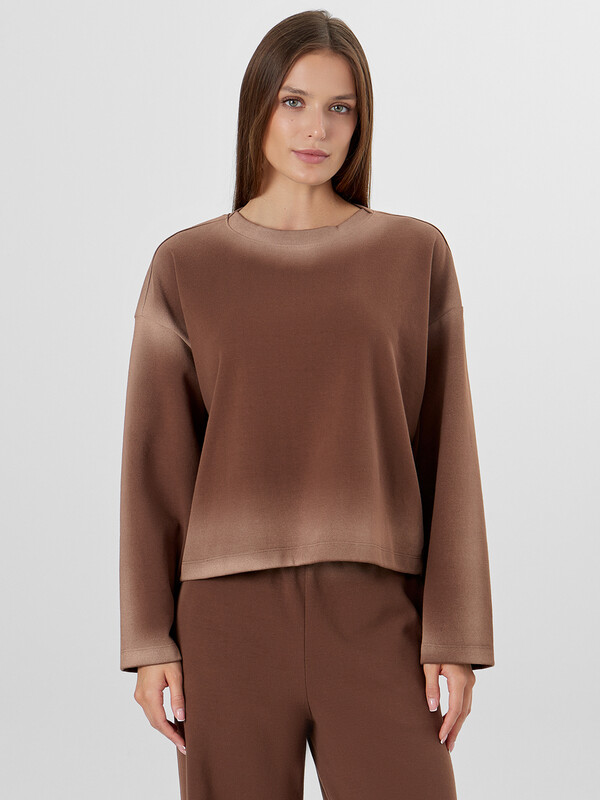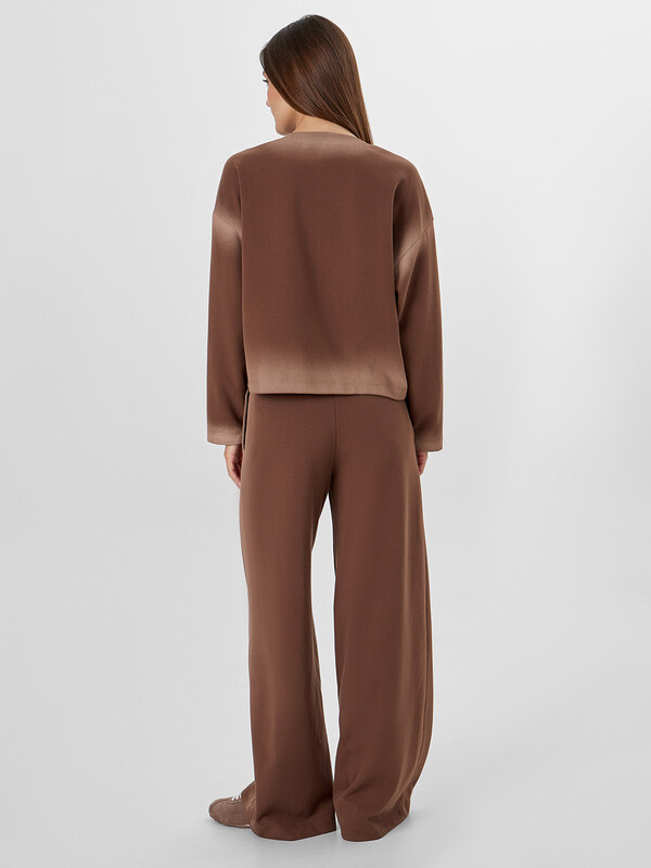 Набор состоит из свободного укороченного свитшота и прямых брюк, выполненных из мягкого трикотажа. Свитшот с круглой горловиной и длинными широкими рукавами легко сочетается с любым низом, а укороченный крой позволяет создавать модные многослойные образы.