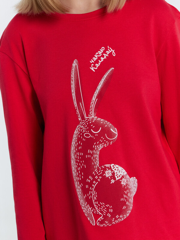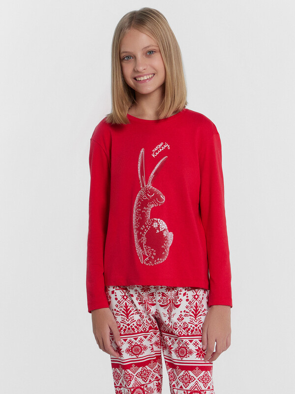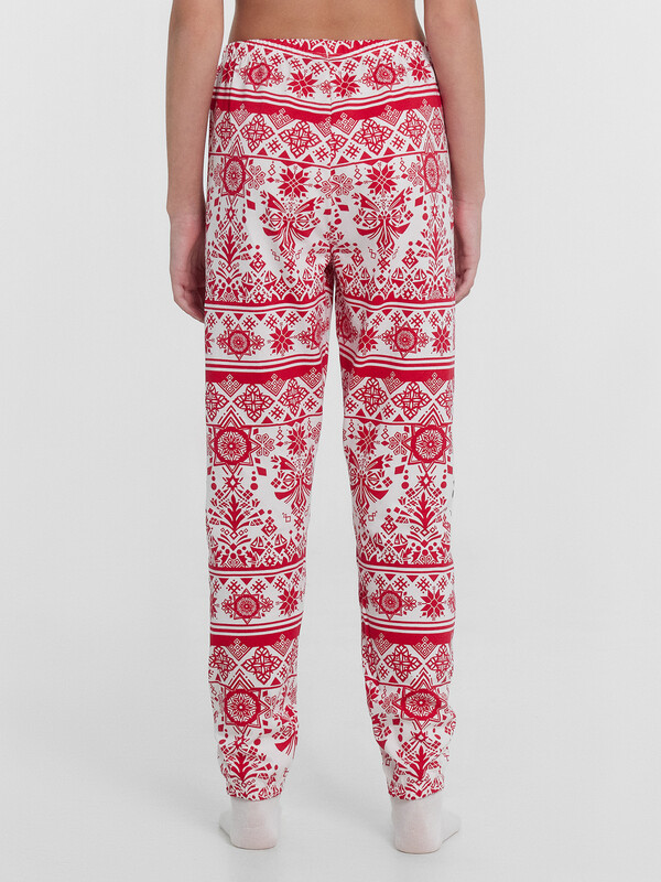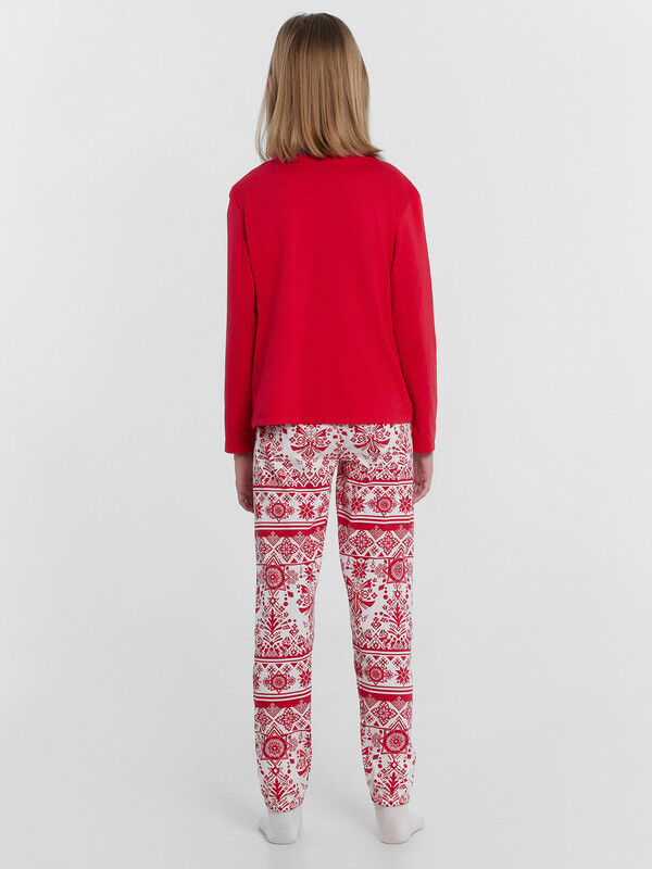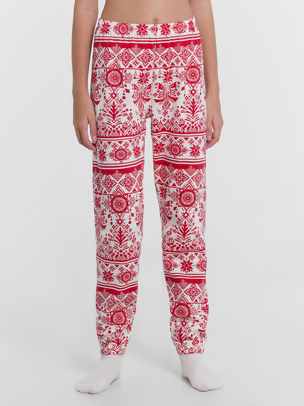 Горловина круглой формы с притачной обтачкой из основного полотна. Рукава длинные втачные. Перед и спинка цельнокроеные. Низ джемпера и рукавов обработан швом в подгибку. Брюки длинные, немного заужены к низу. Пояс цельнокроенный с эластичной тесьмой внутри. Низ брюк застрочен с эластичной тесьмой внутри.