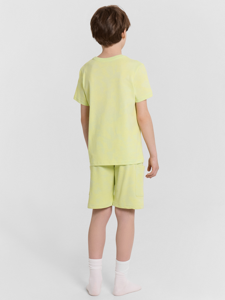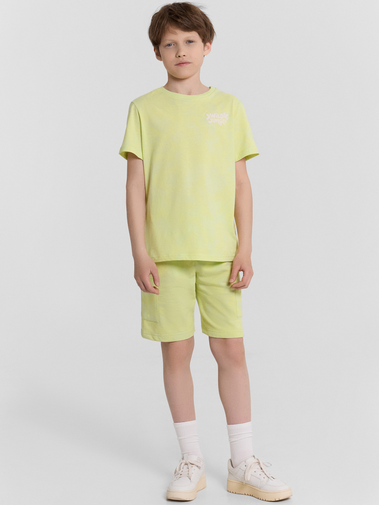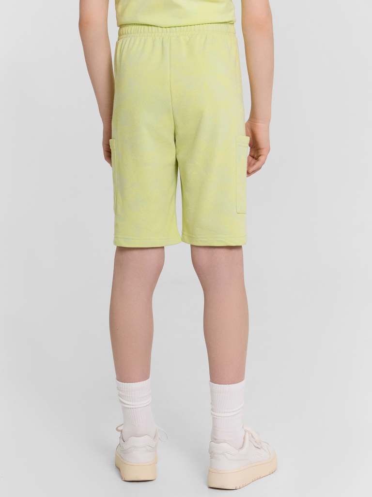 Шорты прямого силуэта. Пояс отрезной с эластичной тесьмой внутри. По поясу проложены две декоративные строчки, внутри пробиты петли и втянута х/б тесьма. По переду имитация гульфика. На деталях переда накладные карманы. Низ изделия обработан швом в подгибку.