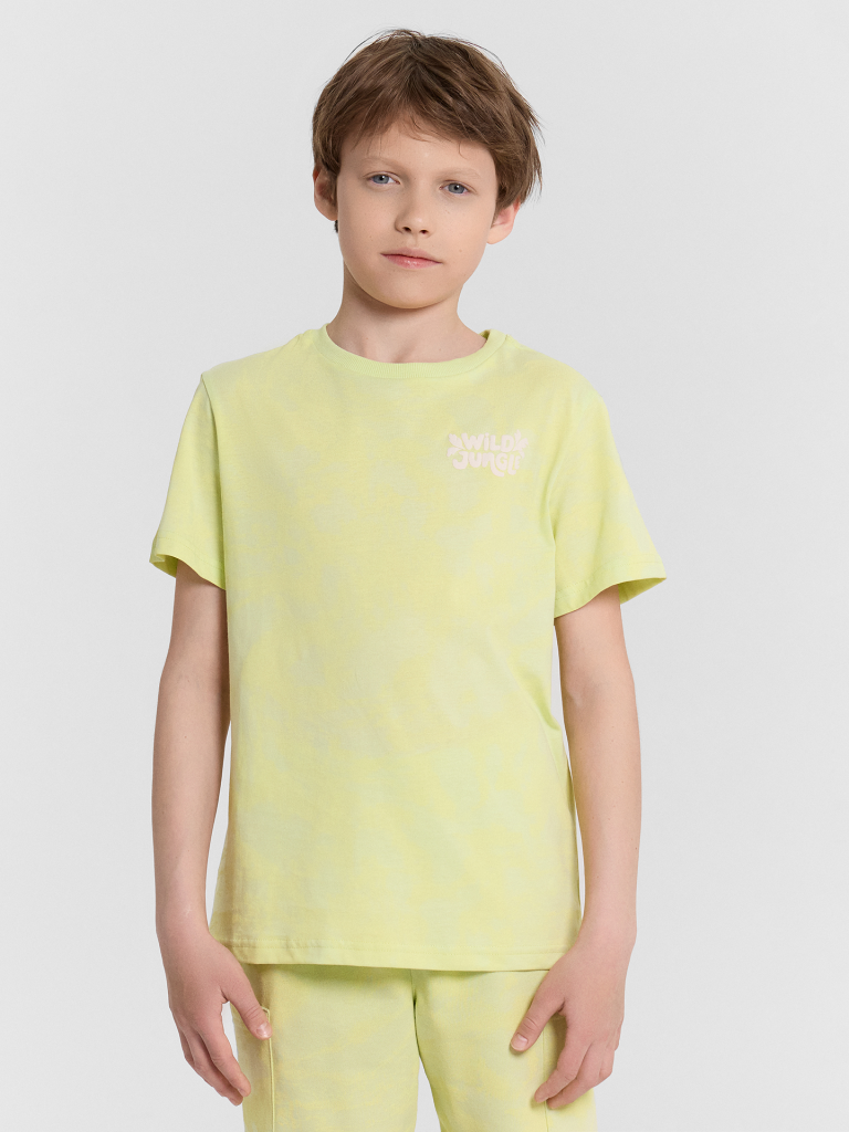 Футболка прямого силуэта. Рукава втачные короткие. Горловина круглой формы, обтачка из рибаны. Шов втачивания рибаны по спинке закрыт бейкой из основного полотна. Низ футболки и рукавов обработан швом в подгибку.