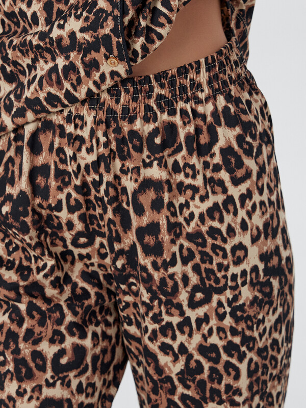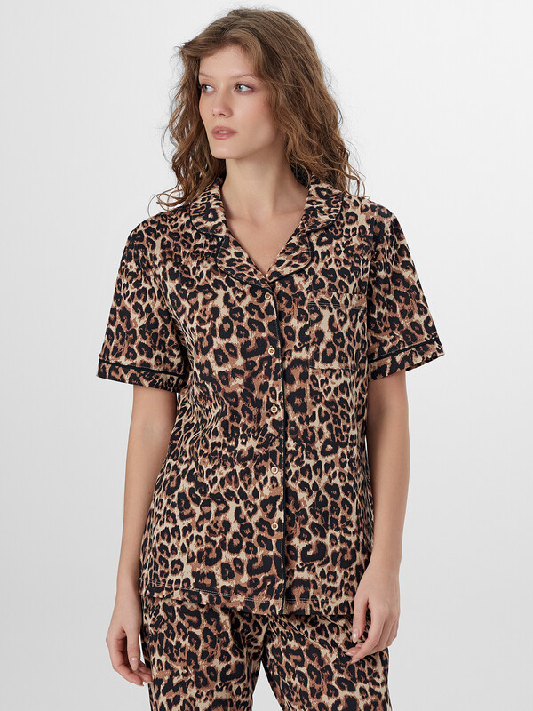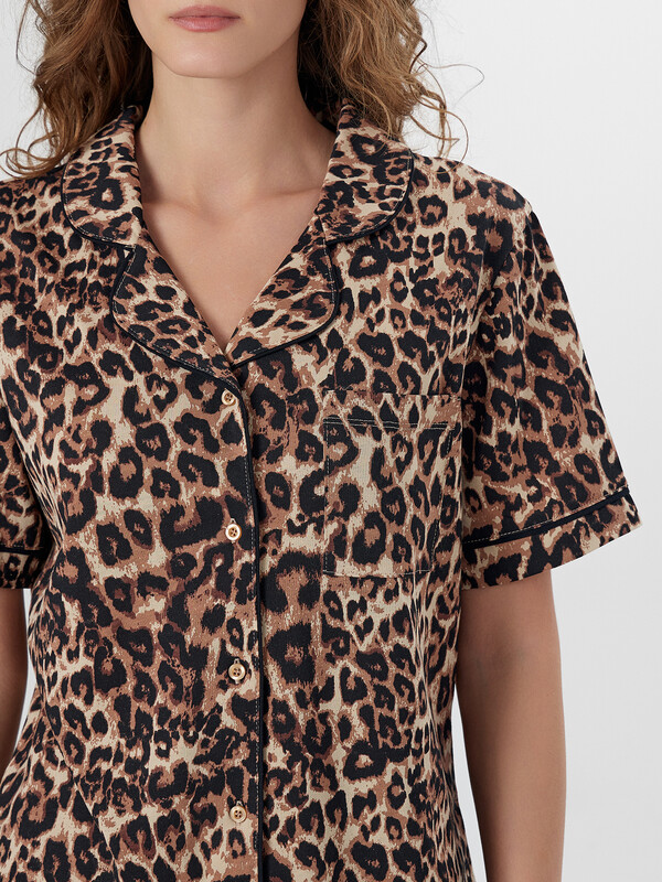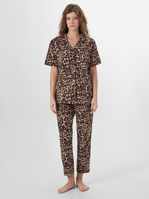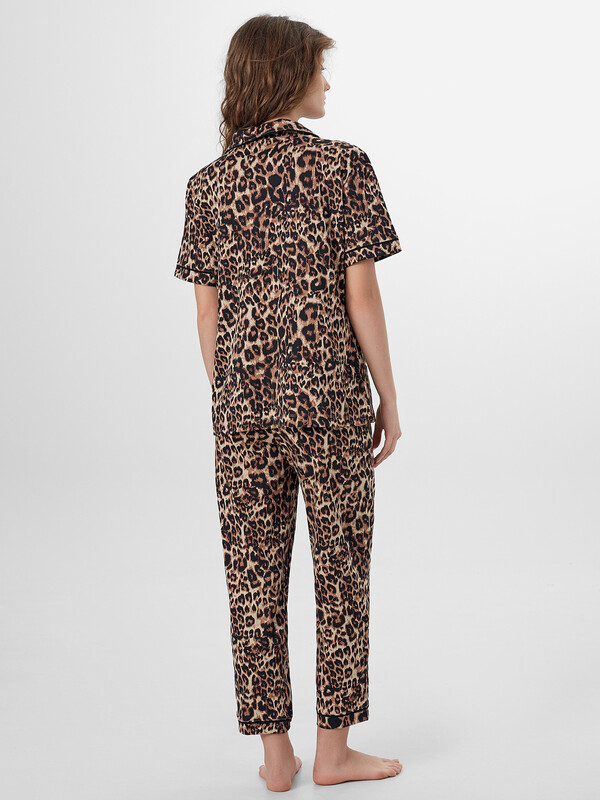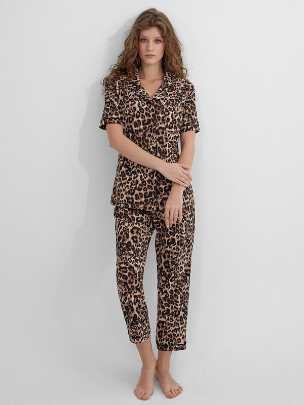 Женская пижама с леопардовым принтом создана для комфортного отдыха. В набор входит свободный жакет и уютные укороченные брюки-бриджи.