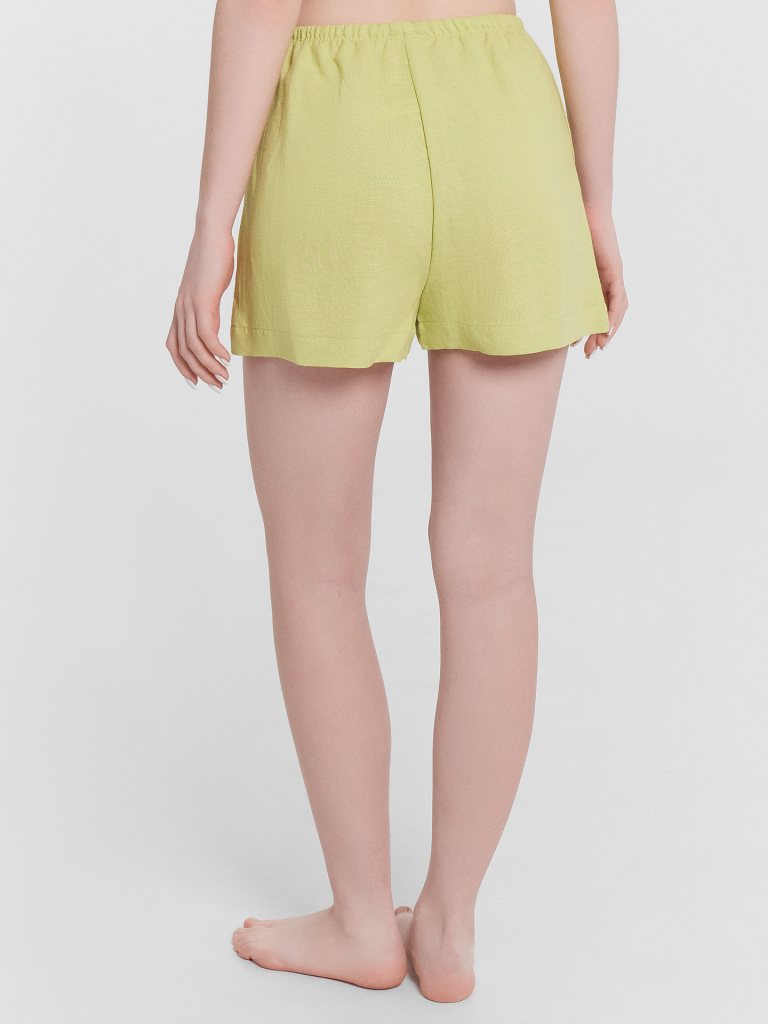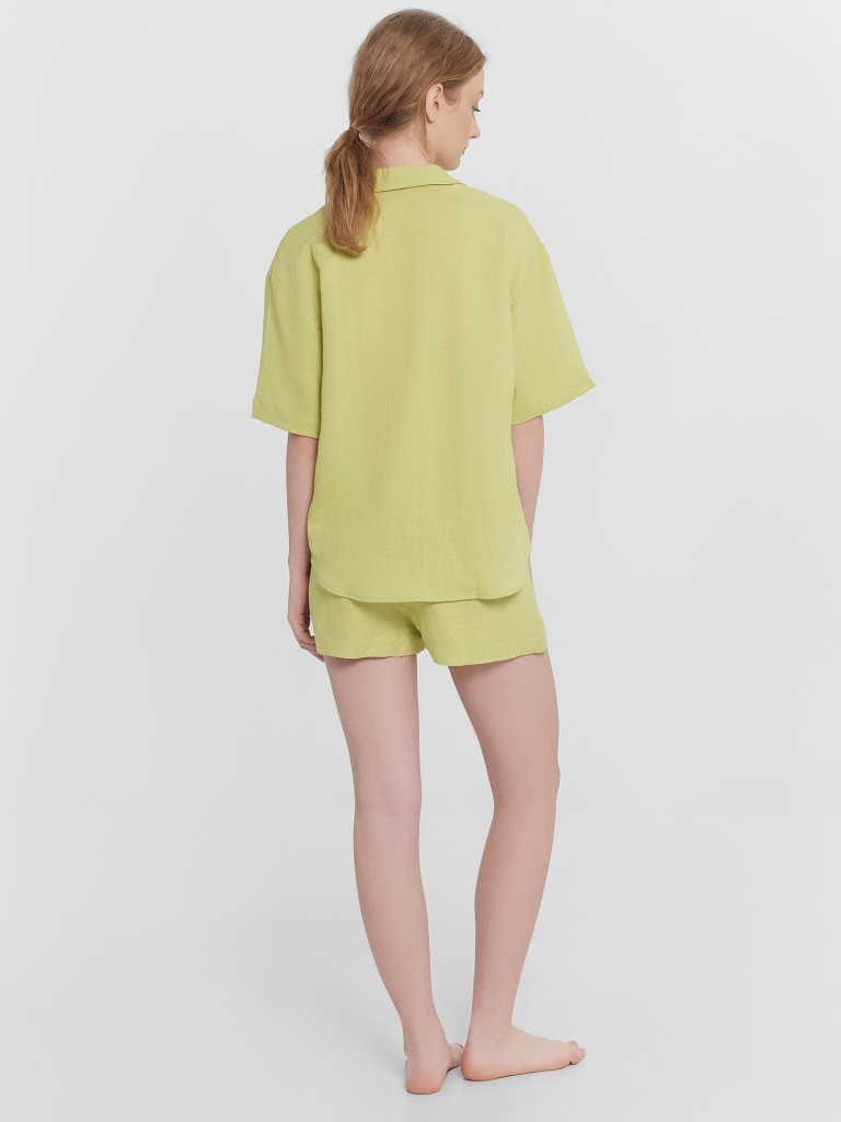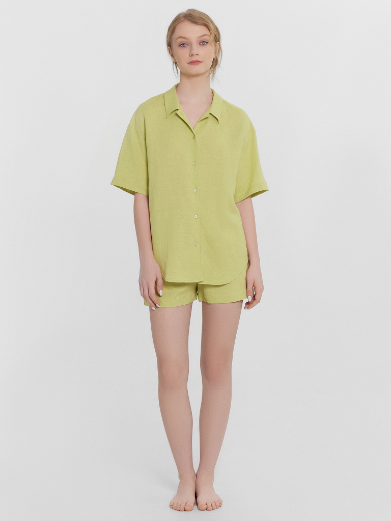 Женская пижама, выполненная из сочетания льна и вискозы. Она сочетает в себе стиль и комфорт, идеально подходя для повседневного ношения дома. Рубашка свободного силуэта с отложным воротником и короткими рукавами имеет центральную застежку на пуговицах, что обеспечивает удобство и легкость в носке. Шорты свободного кроя с высокой посадкой и карманами в боковых швах добавляют практичности и комфорта. Модель выполнена из натурального льна и вискозы. Такое сочетание материалов обеспечивает оптимальный комфорт и долговечность. Лён - это натуральный материал, который обладает отличными дышащими свойствами и дарит прохладу в жаркие дни. Вискоза, в свою очередь, добавляет мягкости и шелковистости, делая изделие особенно приятным к телу. Эта пижама станет вашим любимым выбором для уютных вечеров и расслабленного отдыха дома.