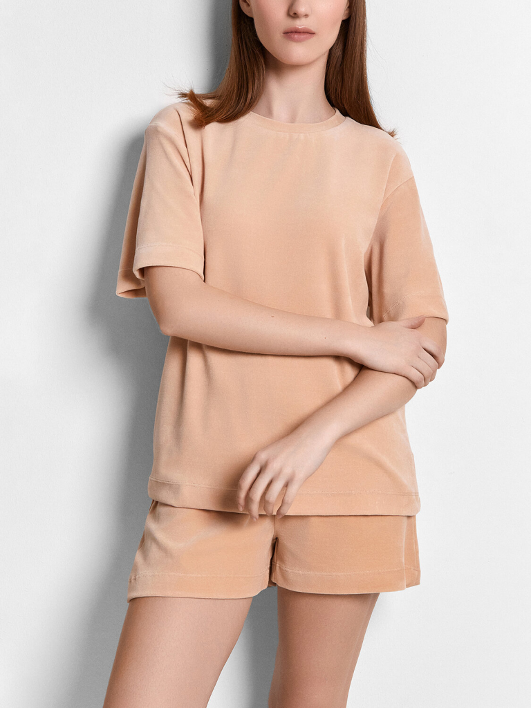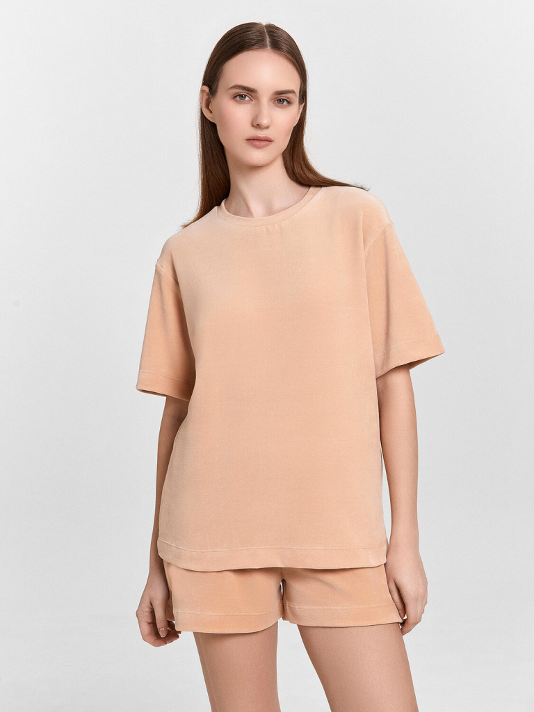 Комплект состоит из джемпера и шорт. Джемпер свободного силуэта. Горловина обработана обтачкой из основного полотна. Рукава втачные короткие, плечо спущено. Низ изделия и рукава обработан в подгибку. Шорты свободного силуэта, короткие. Пояс цельнокроеный, с втаченной эластичной тесьмой (вн. 30мм 30RV). Низ шорт обработан швом в подгибку.