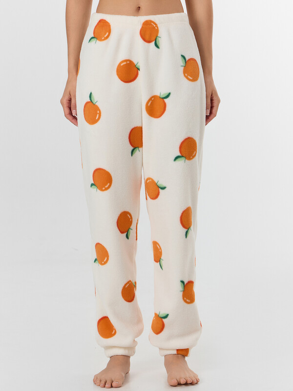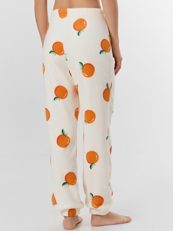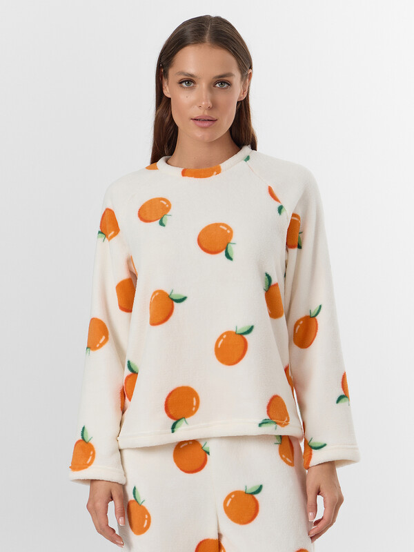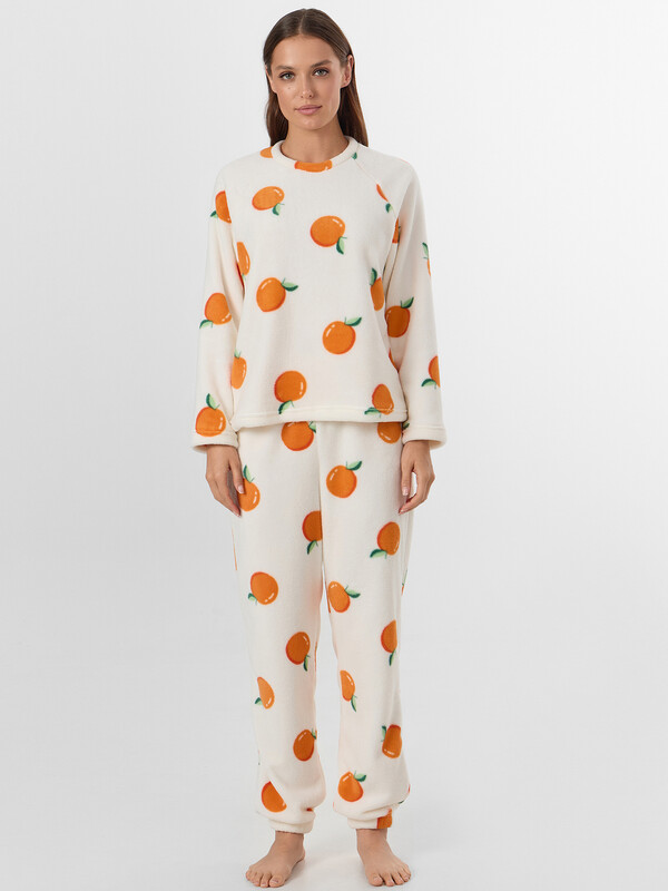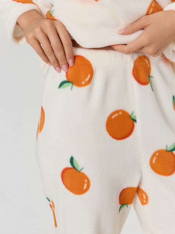 Молочная домашняя пижама для женщин с солнечным принтом мандаринов подарит ощущение тепла и уюта. Нежный плюшевый материал невероятно мягкий и приятный к телу, а яркие цитрусы на джемпере и брюках создают радостное настроение.