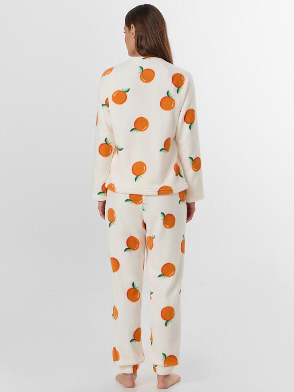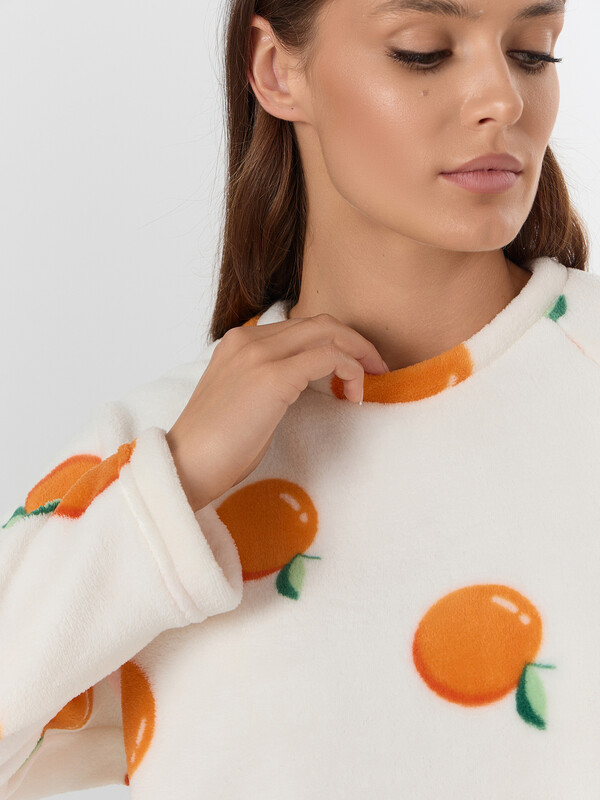 Все срезы изделия аккуратно обработаны, что гарантирует комфорт и долговечность. Мягкий плюш создает ощущение комфорта и нежности. В этой пижаме вы будете чувствовать себя уютно в прохладные вечера, а солнечный цитрусовый принт будет круглый год дарить заряд радости и тепла.