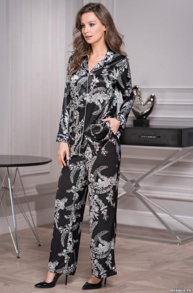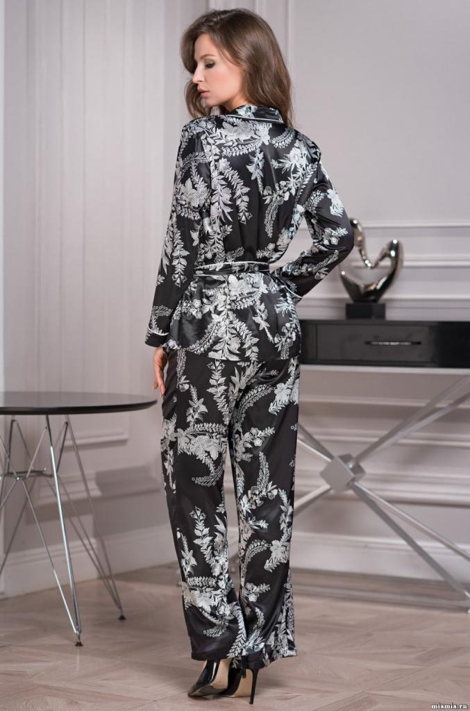 Жакет Mia-Amore на пуговицах с брюками выполнены из принтованного смесового шелка. Край борта жакета, рукава и карманы декорированы контрастным тонким кантом.