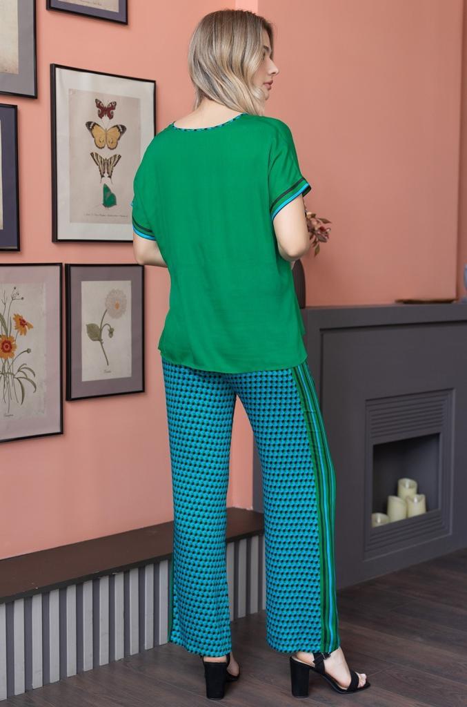 Комплект топ и брюки Mia-Amore выполнен из вискозного полотна с шелком. Топ из однотонной зелёной вискозы, на груди декоративный карман с полосатой отделкой, по низу рукавов яркая полосатая отделка. Горловина окантована принтованным компаньоном. По бокам брюк прямого силуэта полосатая отделка.