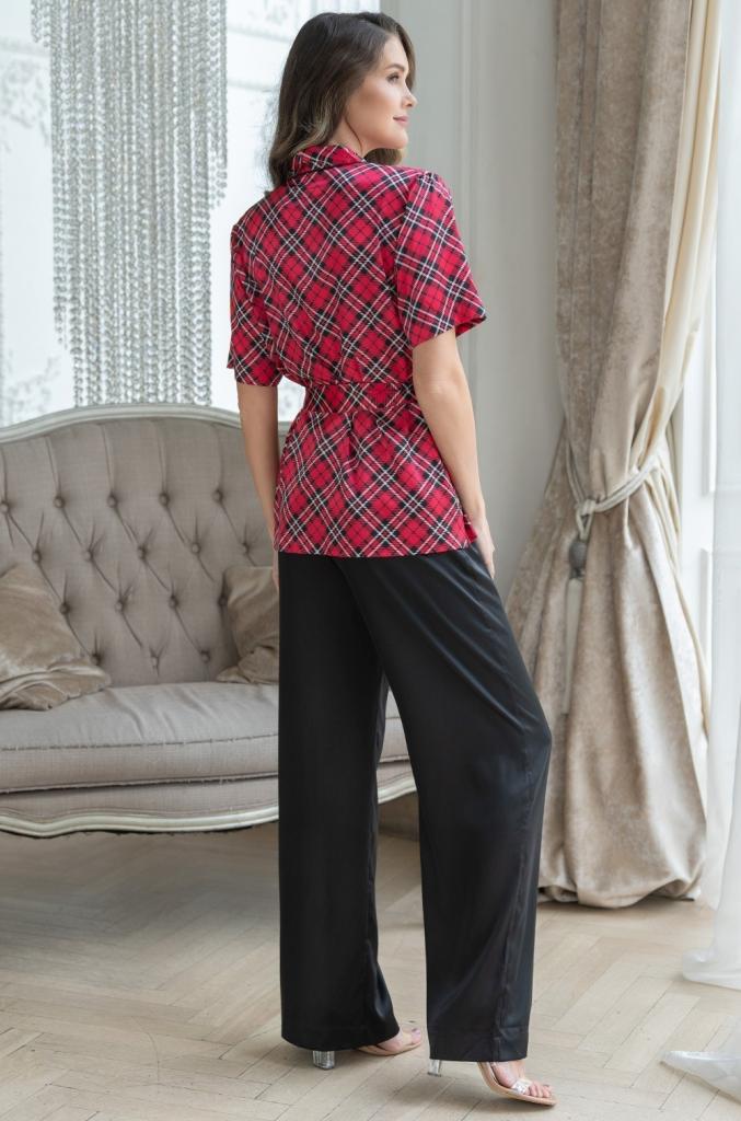 Комплект-тройка Mia-Amore состоит из жакета c короткими рукавами, топа и брюк. Топ и брюки выполнены из однотонного искусственного шелкового полотна с атласным блеском, а жакет – из принтованного. По талии жакет запахивается на пояс, в боковых швах брюк обработаны карманы.