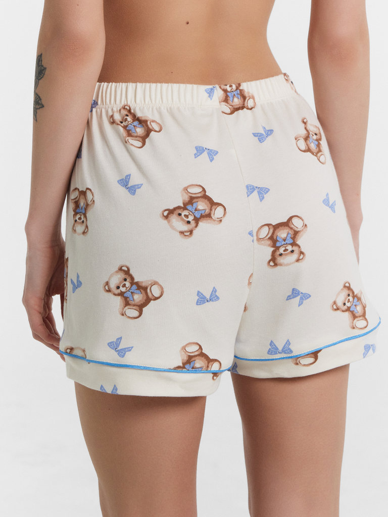 Женская хлопковая пижама свободного силуэта – идеальный выбор для комфортного и стильного отдыха. Рубашка прямого кроя с отложным воротником и лацканами, короткими рукавами и застежкой на пуговицы добавляет элегантности и удобства. Свободные шорты длины мини с эластичным поясом и атласной тесьмой, завязывающейся на бантик, обеспечивают дополнительный комфорт и очарование. Особенностью этой модели являются контрастные канты на рукавах, воротнике и передней части рубашки, что придает ей стильный и утонченный вид. Эта пижама станет отличным вариантом для сна, отдыха и выполнения домашних дел, даря вам комфорт и красоту в каждом моменте. Рекомендуем эту милую модель для самых любимых!