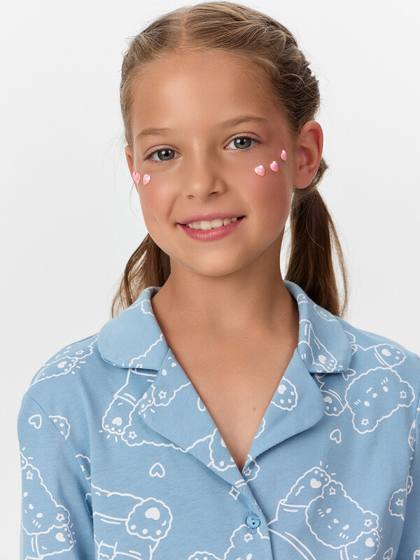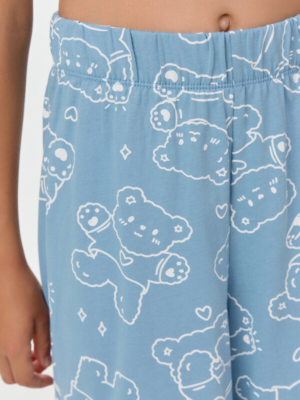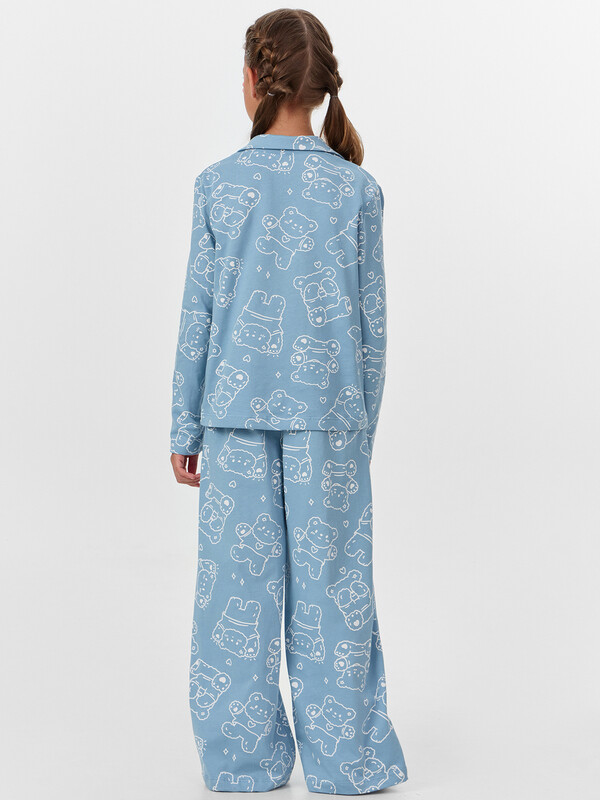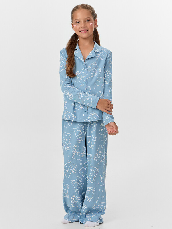 Подарите своему ребенку комфорт и очарование с домашним комплектом, созданным для приятного отдыха и активных домашних игр. В комплект входят рубашка и брюки, выполненные из мягкой хлопковой кулирки — натурального материала, который нежно заботится о коже и обеспечивает отличную воздухопроницаемость. Рубашка прямого силуэта с отложным воротником выглядит аккуратно и стильно. Спущенное плечо и длинные рукава добавляют свободы движений, а центральная застежка на пуговицы делает модель удобной и практичной. Брюки слегка расширены к низу, что придает образу легкость и современность. Эластичный пояс мягко фиксирует посадку, не сдавливая животик, а низ брюк аккуратно застрочен швом в подгибку. Этот комплект — идеальный выбор для дома: он сочетает в себе комфорт, качество и милый стиль. Подходит для отдыха, игр и уютных вечеров.