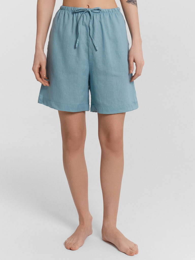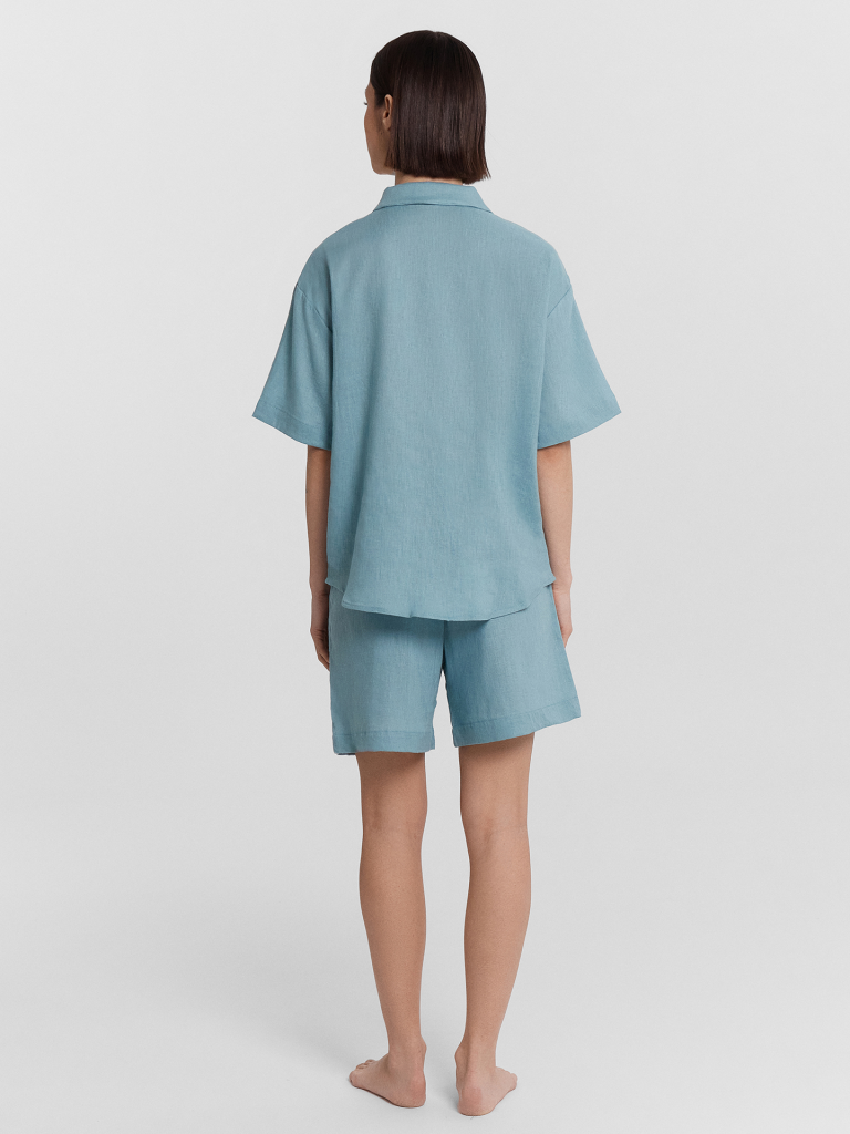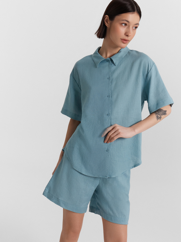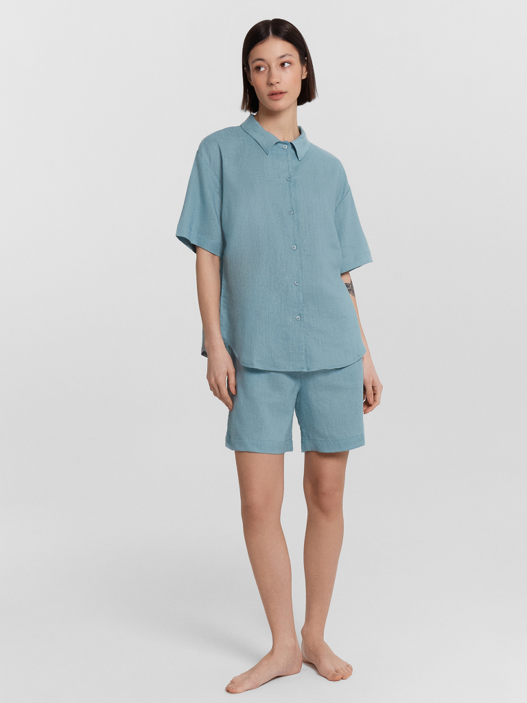 Комплект женский состоит из жакета и шорт. Жакет свободного силуэта, с воротником стойкой. Рукав втачной короткий, рукав обработан в подгибку. Жакет с центральной застежкой с петлями и пуговицами. Низ застрочен швом в подгибку. Шорты свободного силуэта, высокая посадка. Верх застрочен в подгибку с протянутым шнуром из основного полотна. В боковых швах карманы. Низ шорт обработан вподгибку.