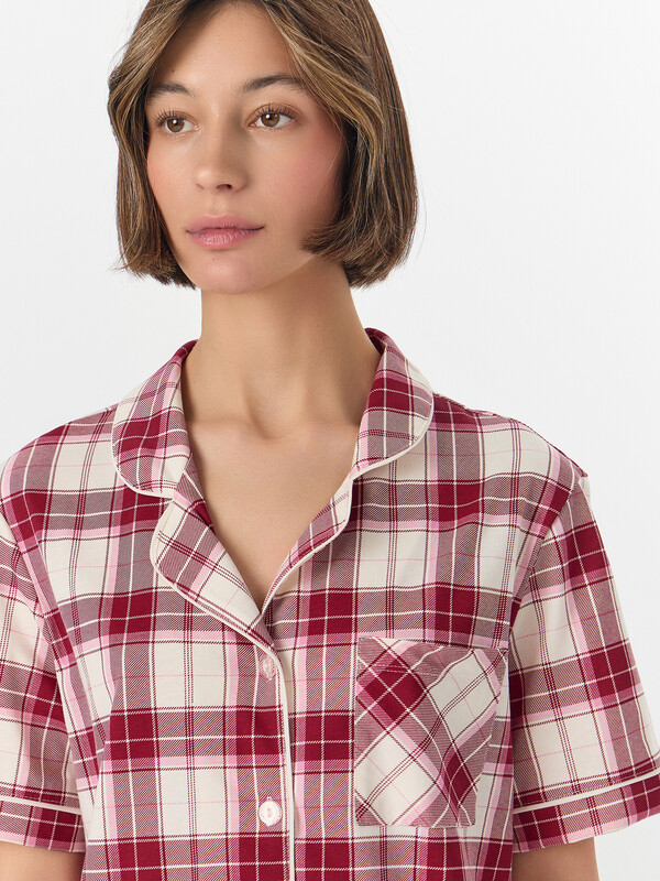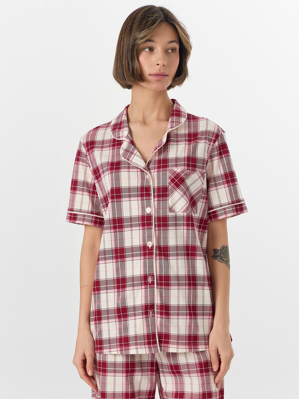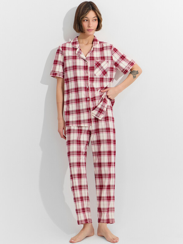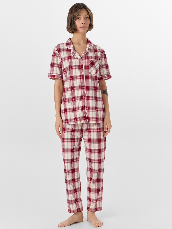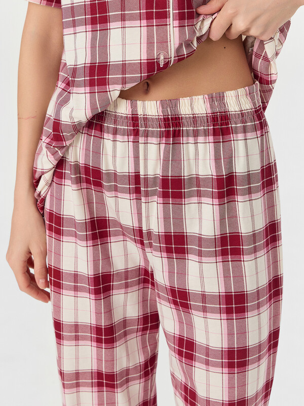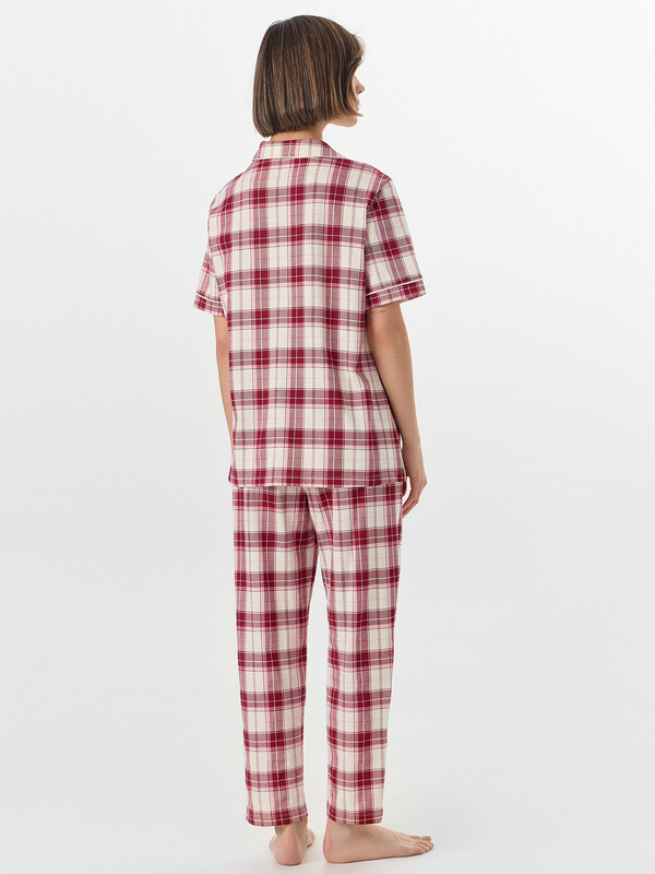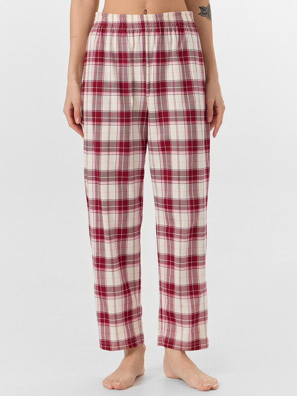 Женская новогодняя пижама Mark Formelle в молочно-бордовую клетку подарит комфорт и праздничное настроение как во время домашнего отдыха, так и во время сна. Этот стильный комплект состоит из рубашки прямого силуэта и брюк, обеспечивая полную свободу движений и уют.