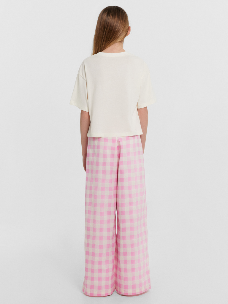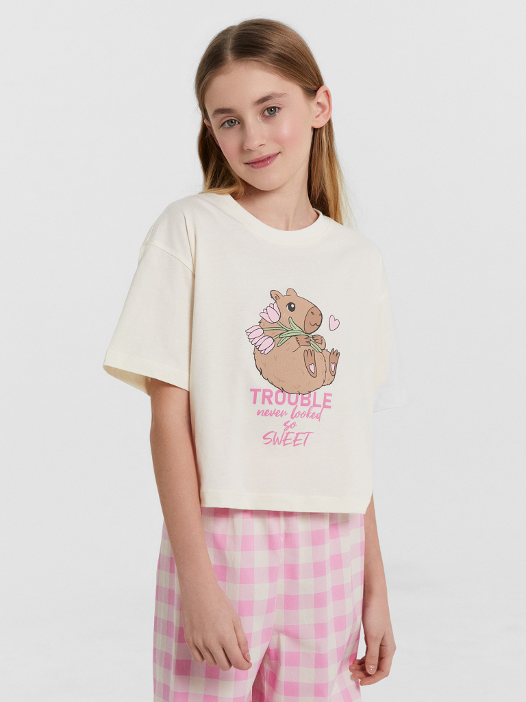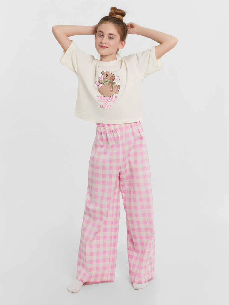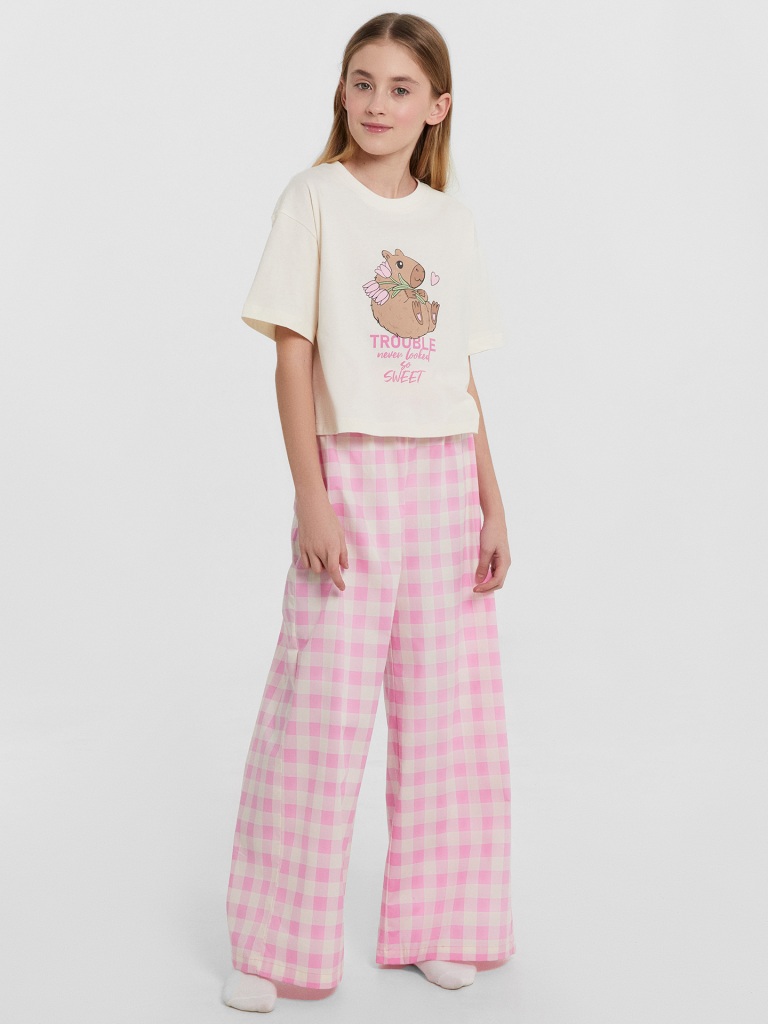 Милая пижама для девочек создана для комфортных и уютных снов. Футболка имеет свободный силуэт, с круглой горловиной и свободными рукавами, а линия плеча слегка спущена, что добавляет удобства и свободы движений. Брюки свободного кроя с эластичным поясом обеспечивают максимальный комфорт и позволяют легко надевать и снимать изделие. Комплект выполнен из приятной на ощупь хлопковой кулирки, которая обладает отличными воздухопроницаемыми и гигроскопичными свойствами, обеспечивая мягкость и уют вашему ребенку во время сна. Хлопковая ткань также гипоаллергенна и безопасна для нежной детской кожи, что делает эту пижаму идеальным выбором для здорового и спокойного сна.