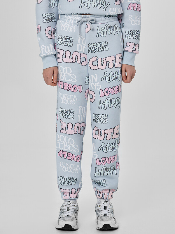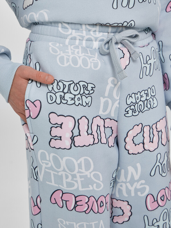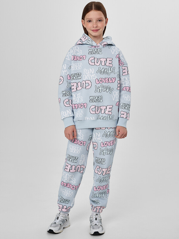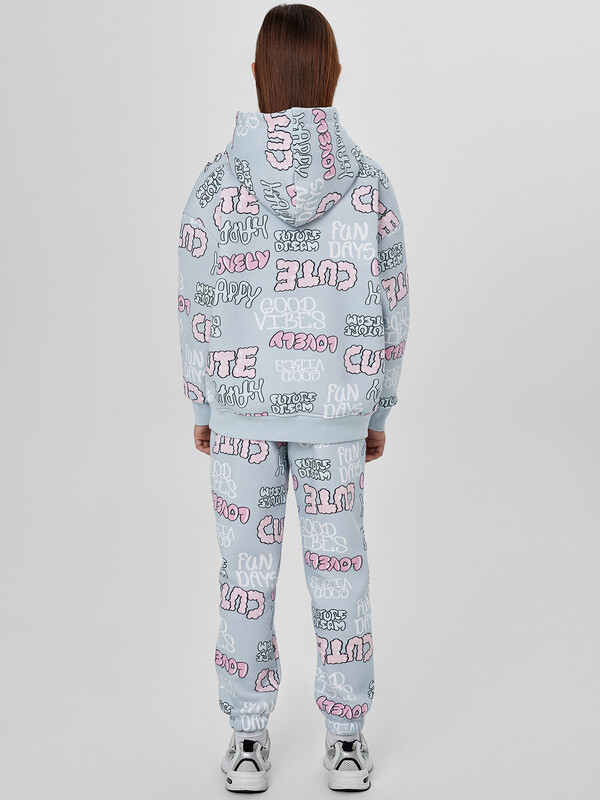 Этот нежно-голубой комплект с добрыми словами «милая», «счастливая», «прелестная» — универсальное решение для повседневной жизни юной модницы. Костюм выполнен из мягкого футера с начесом — такой материал отлично сохраняет тепло, создавая дополнительный комфорт в прохладную погоду.