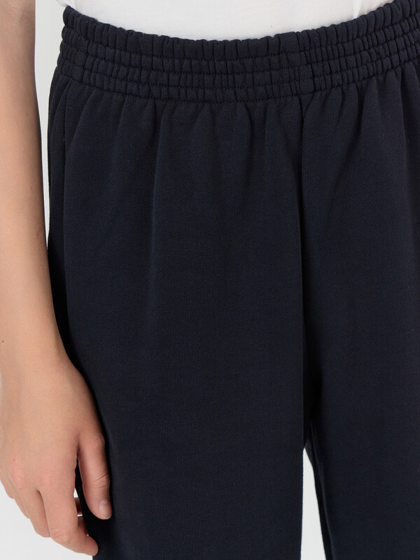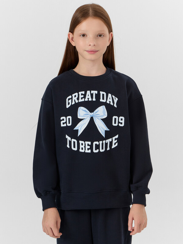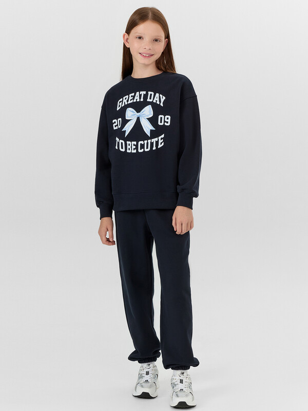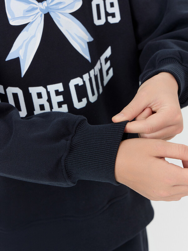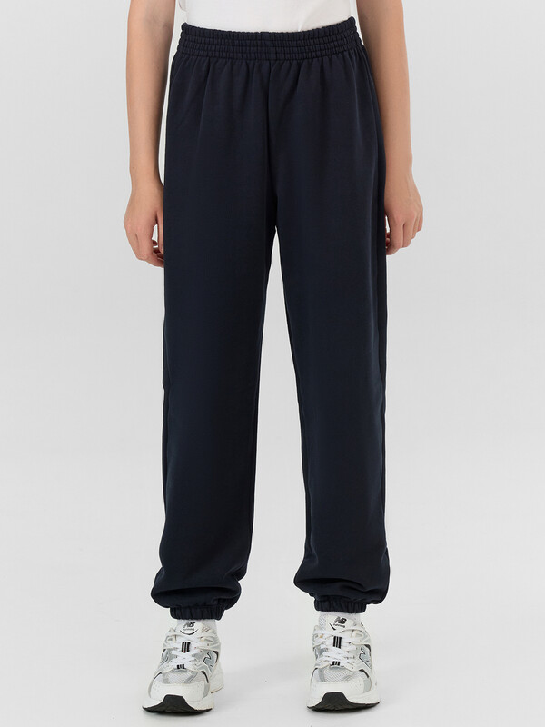 Джемпер свободного силуэта. Рукава длинные, втачные. Линия плеча спущена. Перед и спинка цельнокроенные. Горловина круглой формы обработана обтачкой из рибаны. По низу рукавов и джемпера притачены манжеты и пояс из рибаны. Брюки свободного силуэта. Посадка средняя. Цельнокроеный пояс с эластичной тесьмой внутри. По поясу выполнены три декоративные строчки. По низу брюк застрочена внутрь эластичная тесьма.