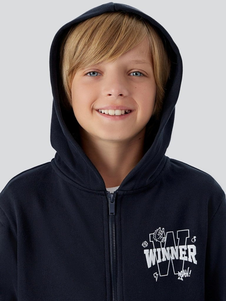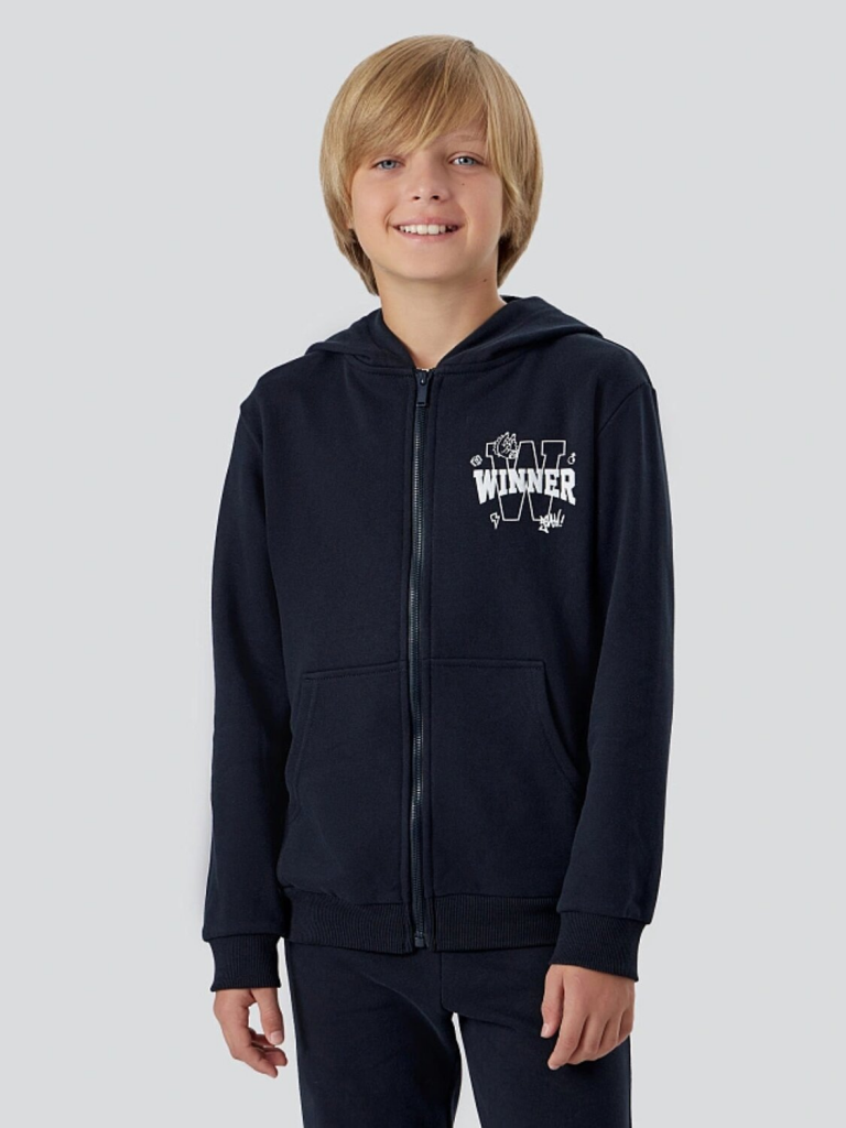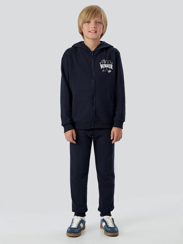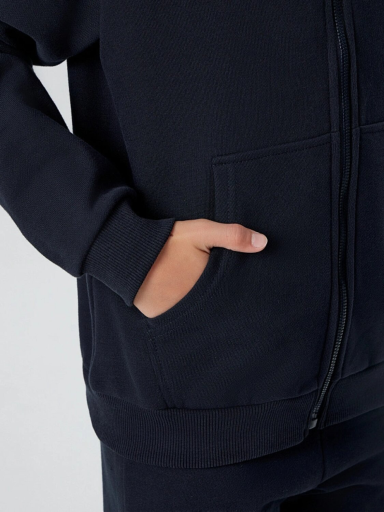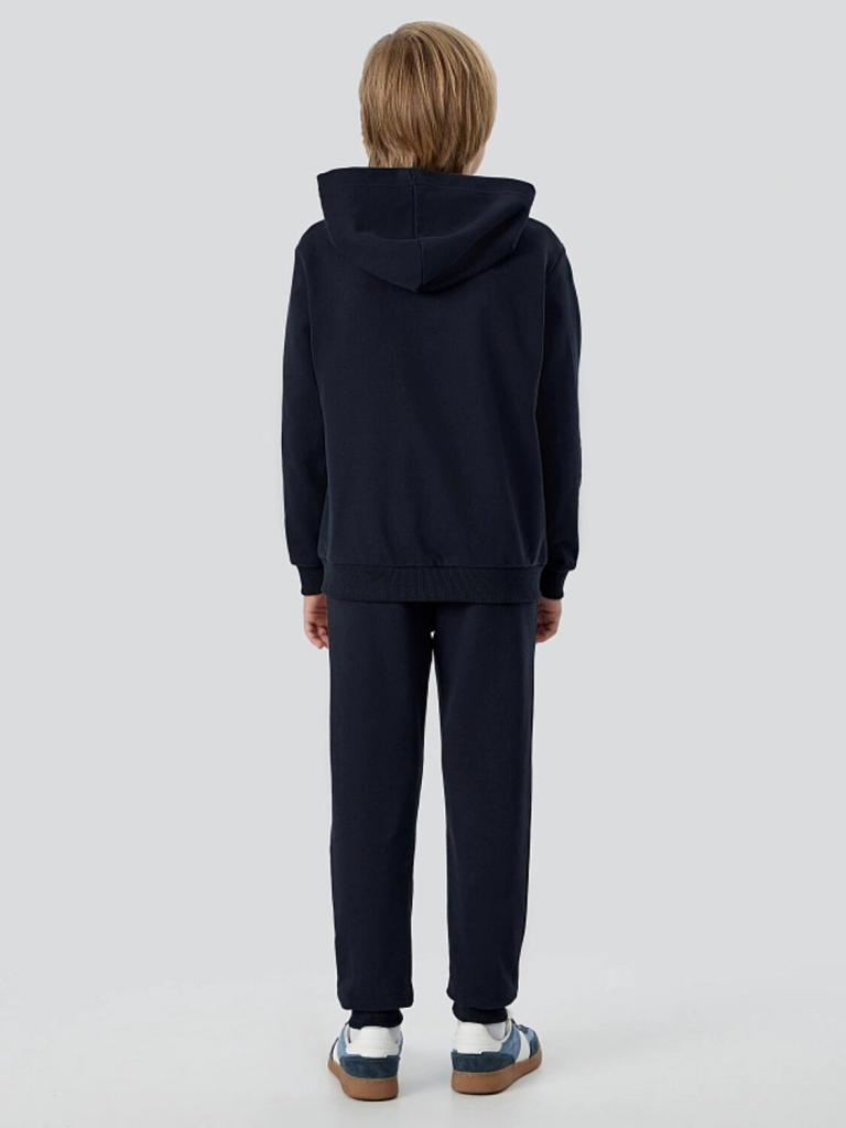 Худи свободного кроя с капюшоном и молнией защищает от ветра, а практичный карман-кенгуру позволяет хранить мелочи. Брюки прямого силуэта с эластичным поясом и регулировочным шнурком обеспечивают идеальную посадку для любых активностей — от игр на улице до занятий спортом.