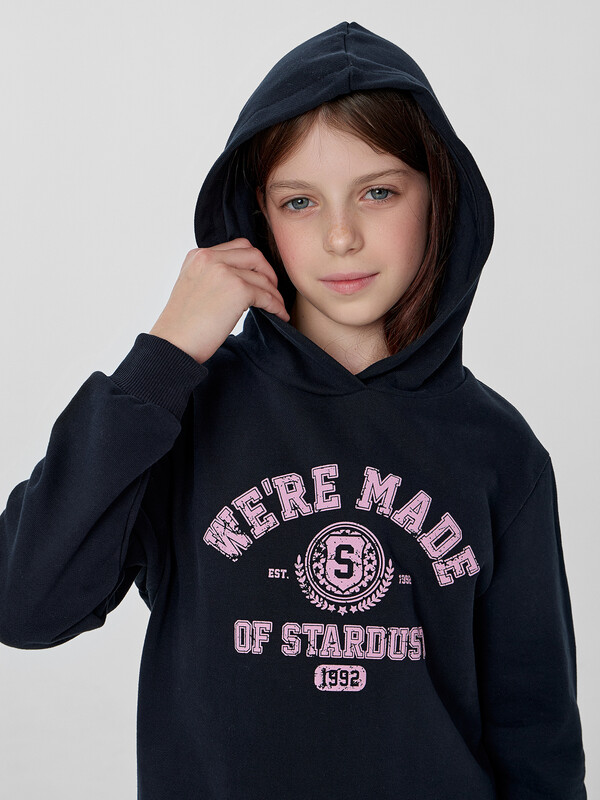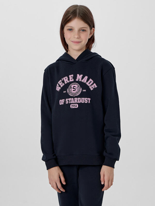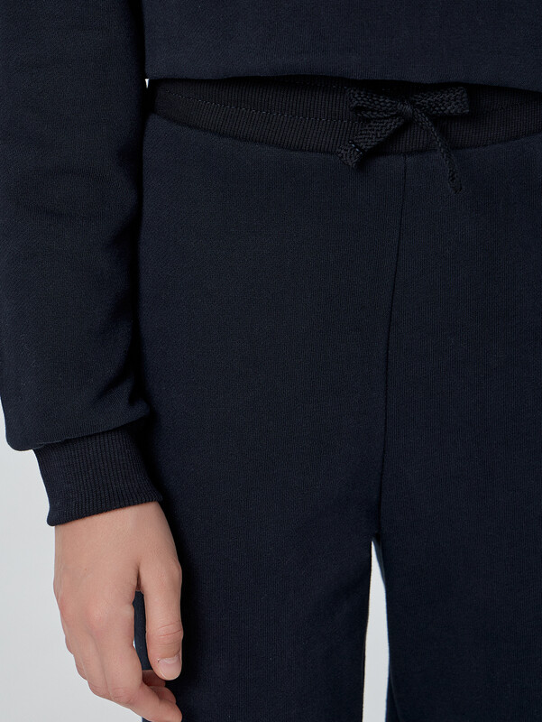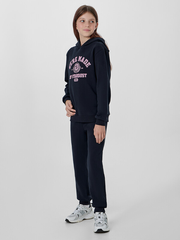 Комплект для самых модных девочек. Выполнен из трикотажного футера без подчеса. Анорак свободного силуэта с капюшоном, спущенной линией плеча, манжетами и поясом из рибаны. Брюки прямого силуэта, с резинкой и регулировочным шнурком в поясе, на манжетах. Уютный комплект!