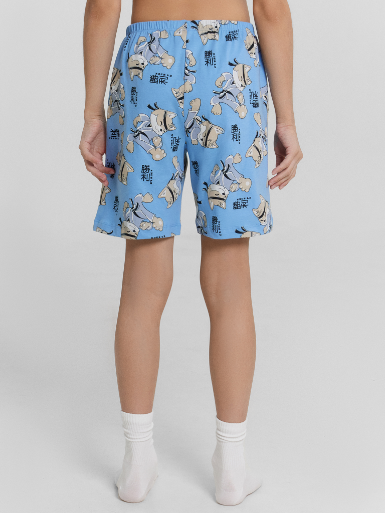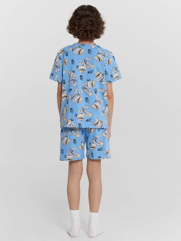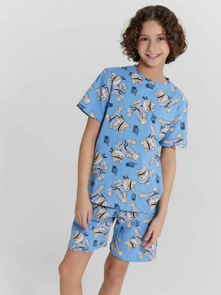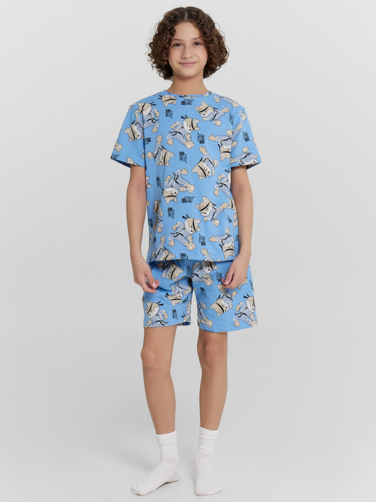 Пижама для мальчиков. Выполнена из хлопкового трикотажа кулирного переплетения. Комплект включает футболку и шорты. Футболка свободная, с круглой горловиной и короткими рукавами. Шорты длиной до колен, с эластичной тесьмой в поясе. Отличный комплект для сна и отдыха!