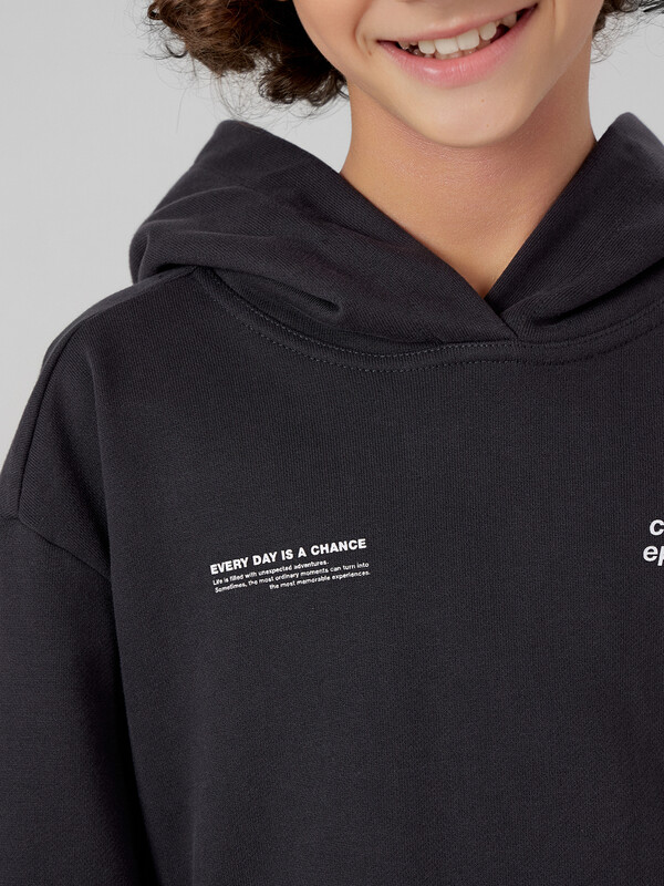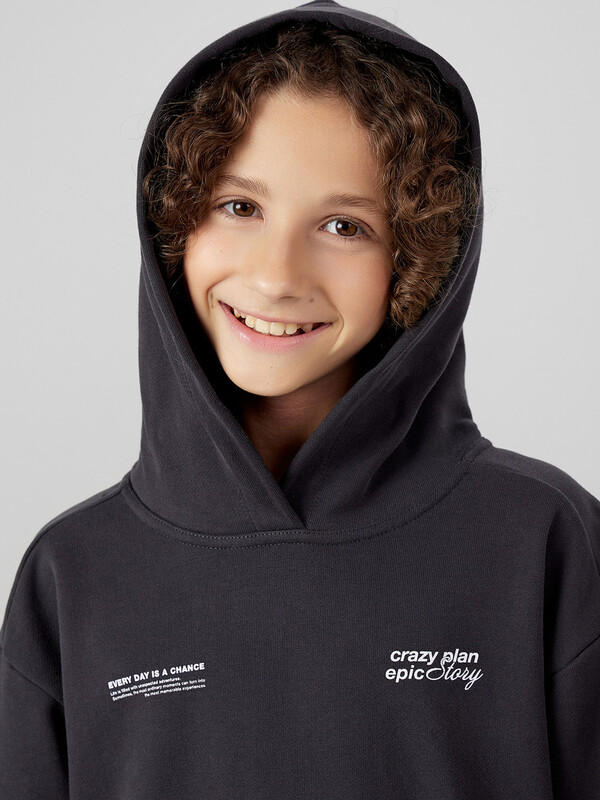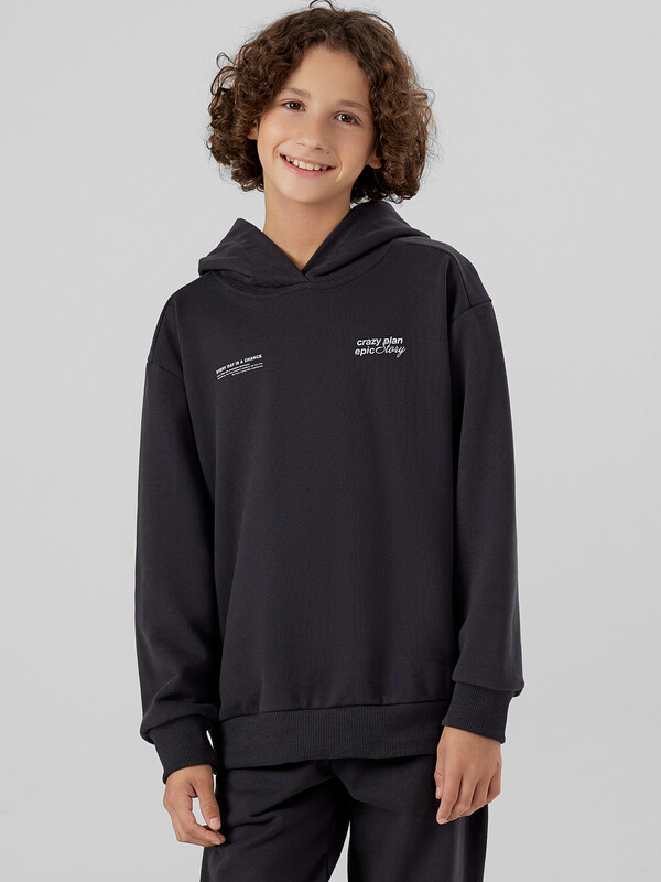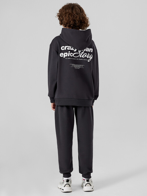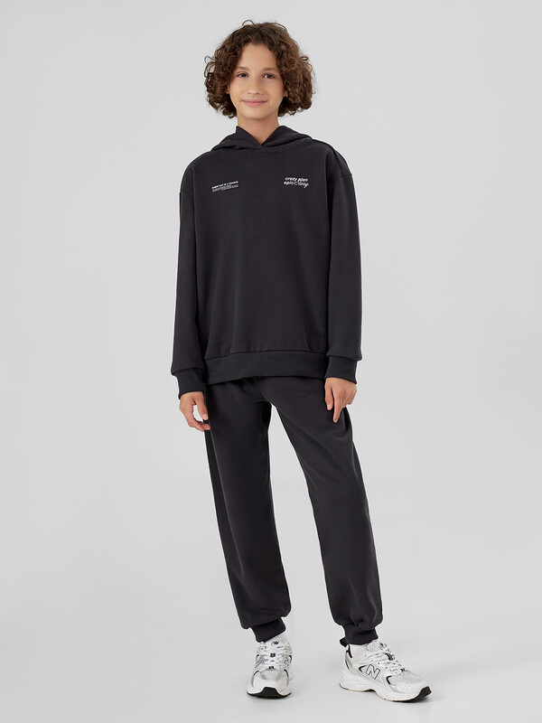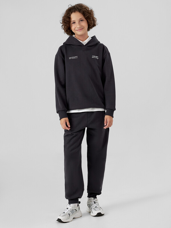 Комплект для мальчиков из худи и брюк — это удобный, стильный и функциональный вариант на каждый день. Свободный силуэт худи с капюшоном обеспечивает максимальный комфорт и не ограничивает движения, а капюшон со средним швом сохраняет форму и защищает в прохладную погоду. Спущенная линия плеча и длинные рукава создают расслабленный современный образ, а манжеты и пояс из рибаны добавляют структуру, аккуратную посадку и устойчивость к растягиванию.Брюки без бокового шва — это дополнительный комфорт, особенно при активной носке. Эластичный пояс с утягивающим шнуром позволяет регулировать объем, обеспечивая удобную фиксацию. Манжеты из рибаны по низу брюк гармонируют с отделкой худи, создавая цельный и сбалансированный образ. Модель выполнена из футера без подчеса — плотного, прочного и воздухопроницаемого материала, который хорошо держит форму и остается комфортным при носке. Комплект прекрасно подходит как для дома, так и для прогулок, игр или занятий — универсальное решение для активного ребёнка.