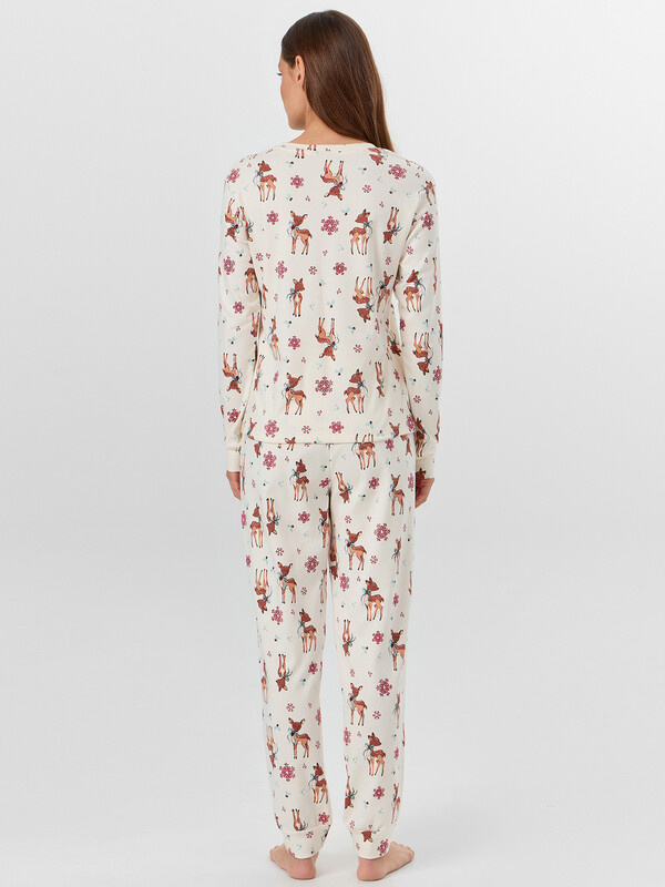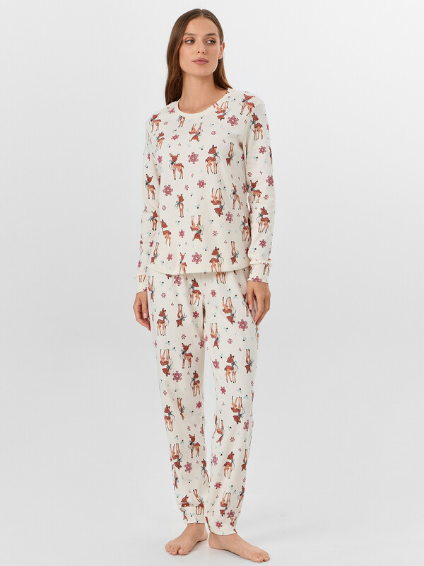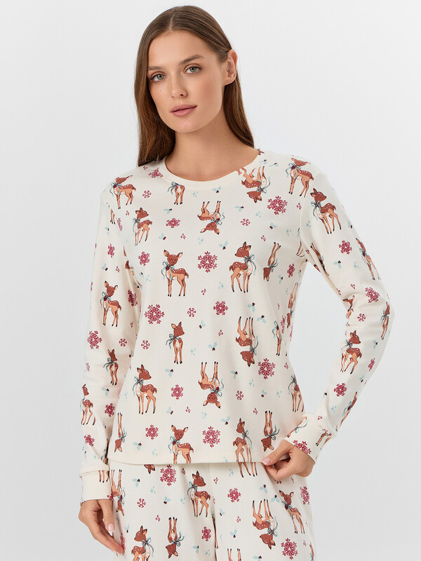 Джемпер с круглой горловиной и брюки с эластичным поясом обеспечивают удобную посадку, не стесняя движений во время сна или отдыха. Принт с новогодними оленями и снежными узорами создает атмосферу зимней сказки, даря ощущение праздника даже в домашней обстановке.