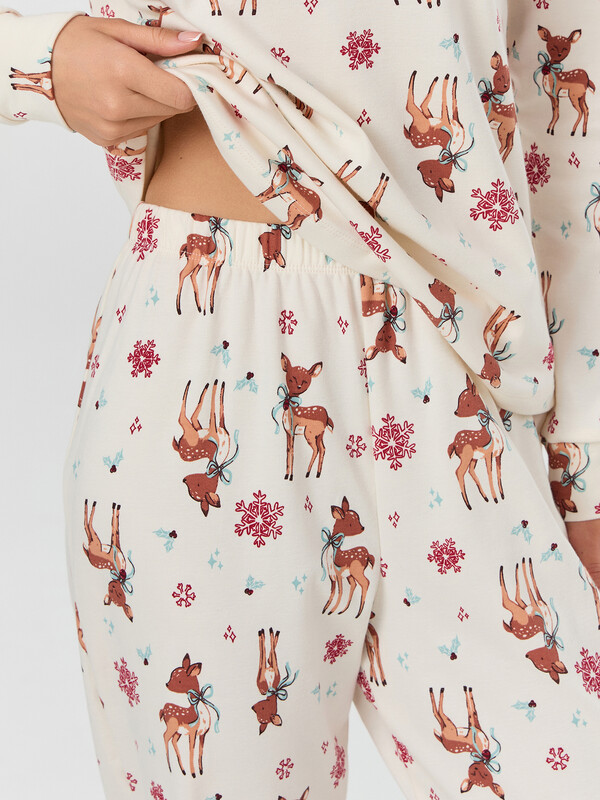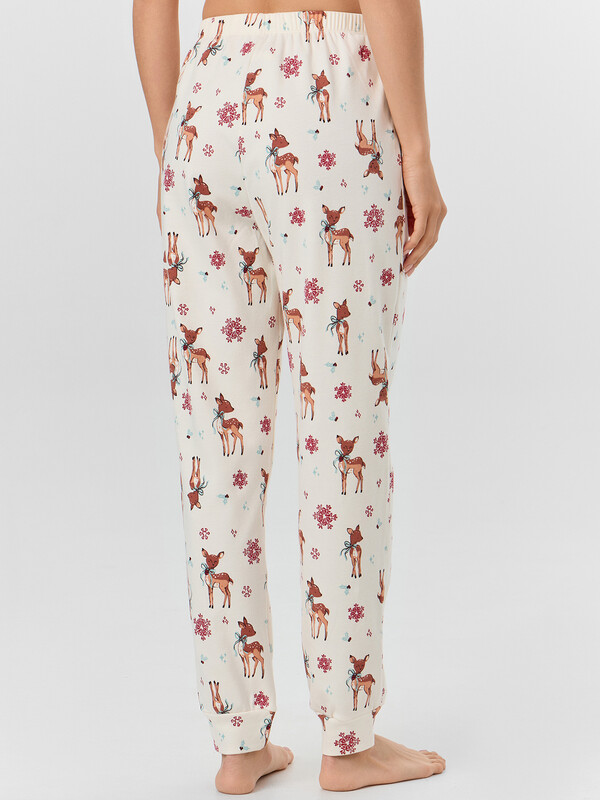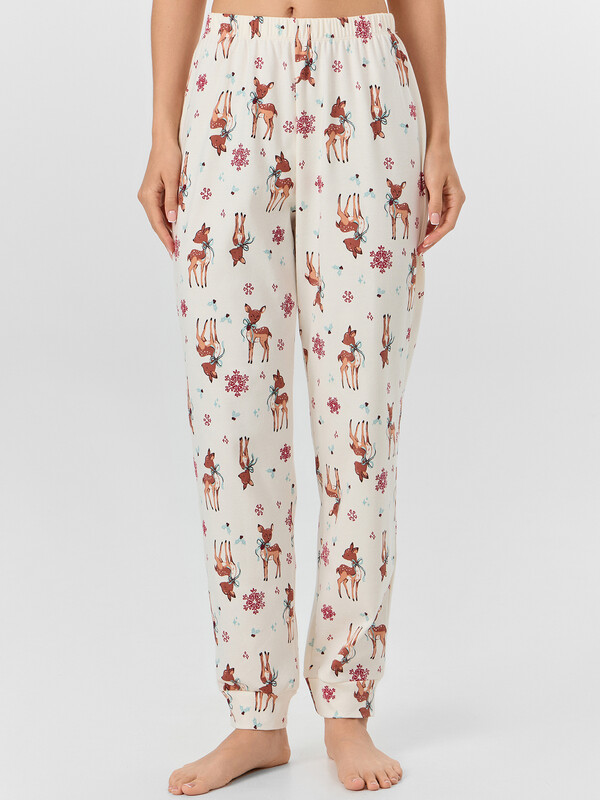 Бежевый новогодний домашний комплект с очаровательным принтом оленей создаст праздничное настроение и подарит комфорт в холодные вечера. Пижама состоит из джемпера свободного кроя и прямых брюк, полностью выполненных из высококачественного хлопка. Мягкая ткань обеспечивает воздухообмен и нежность при контакте с кожей.
