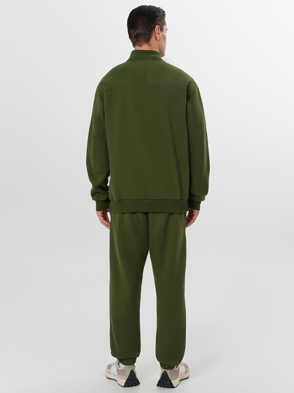 Рукава втачные длинные. Линия плеча слегка спущена. По низу рукавов отрезные манжеты из рибаны. По спинке отрезная кокетка, состоящая из двух частей, цельнокроёная с верхней частью рукавов. Центральная застежка на молнию. По низу изделия отрезной пояс из рибаны.