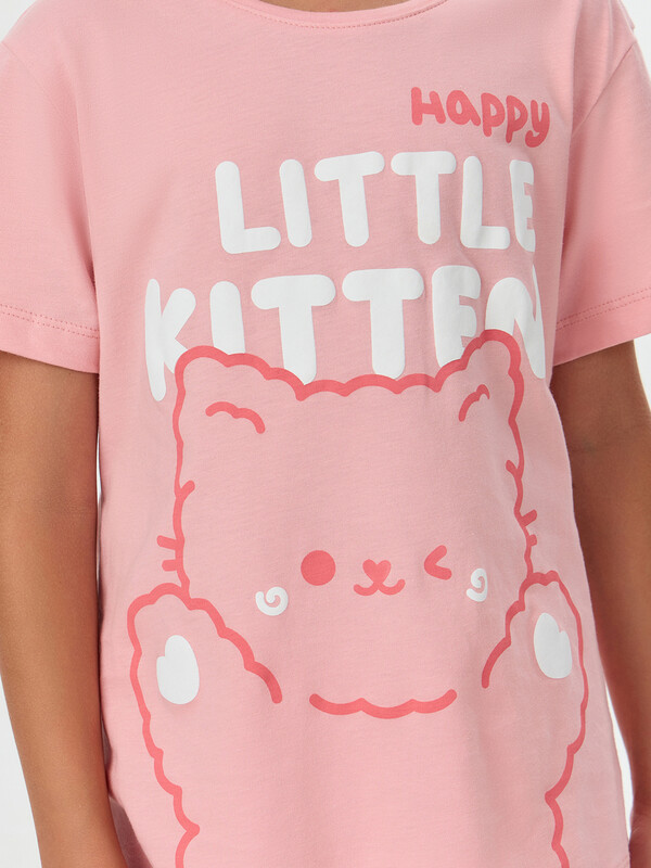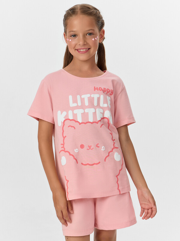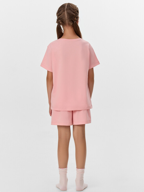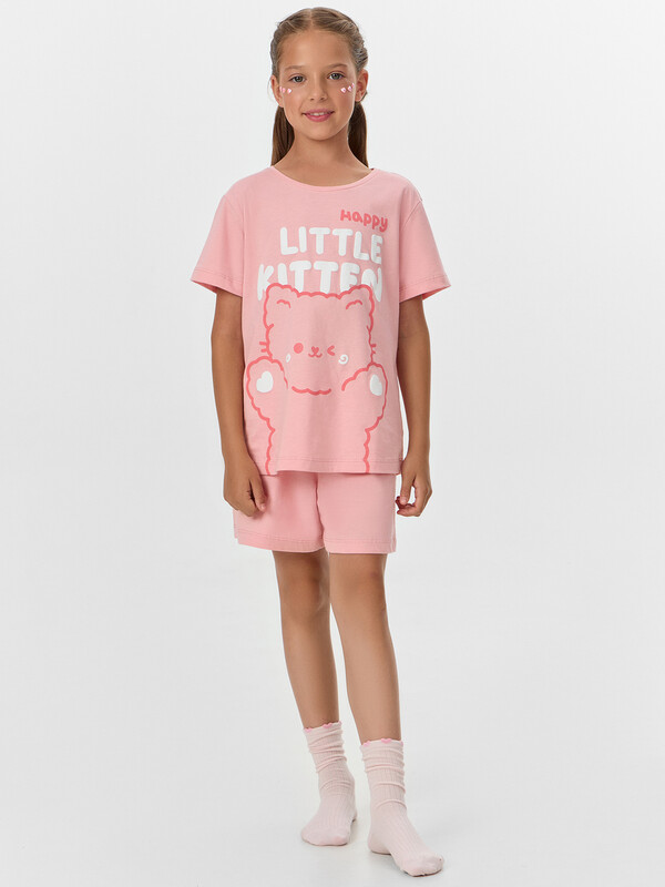 Комплект для девочки, состоит из футболки с короткими рукавами и шорт из натурального хлопка. Подходит для сна и отдыха. Материал очень приятный к телу, хорошо пропускает воздух, что позволяет чувствовать себя комфортно даже в жаркую погоду. Идеальный выбор детской одежды для дома. Стильно, красиво, комфортно. Футболка декорирована интересным принтом, шортики однотонные. Широкий размерный ряд, базовые и яркие расцветки, модели с принтами, рисунками и печатями. Купите детскую пижаму для девочки от Mark Formelle, порадуйте ребенка красивым и стильным подарком!