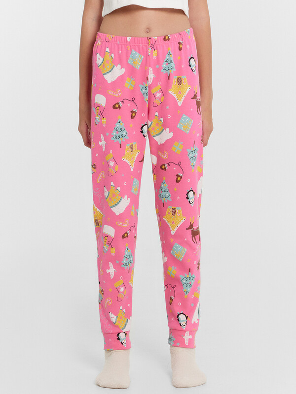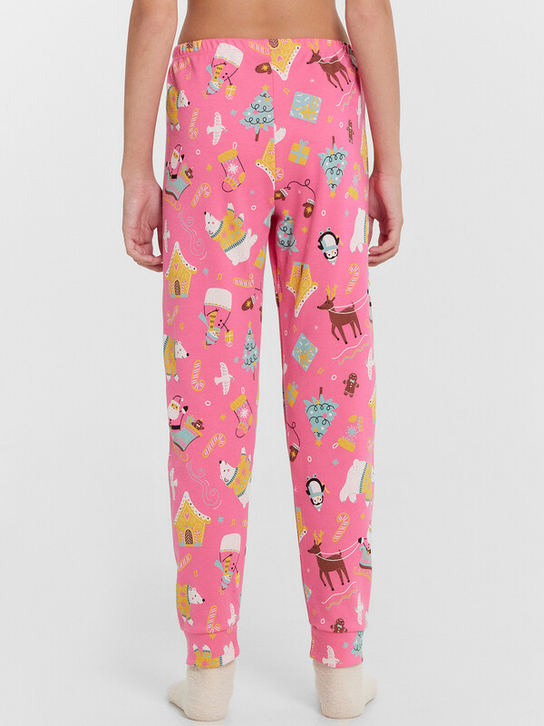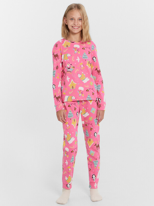 Уютный новогодний комплект для девочек, состоящий из джемпера с длинными рукавами и брюк. Джемпер свободного силуэта. Перед и спинка цельнокроеные. Горловина круглой формы из основного полотна. Рукава втачные, низ рукавов с притачными манжетами. Брюки прямые, с притачными манжетами. Пояс с эластичной тесьмой, которая обеспечивает отличную посадку. Стильная и комфортная детская пижама — лучший вариант для прохладного времени года. Широкий размерный ряд, красивые расцветки моделей в линейке. Рекомендуем!