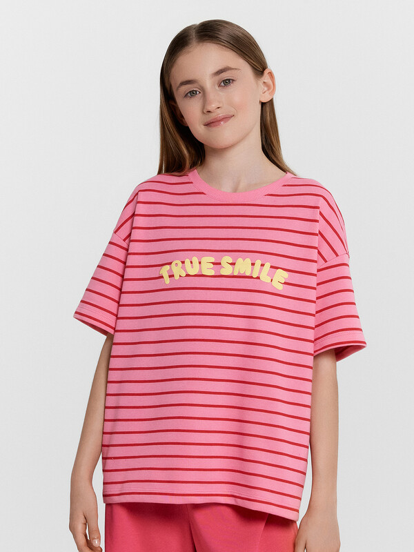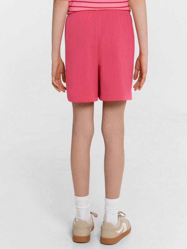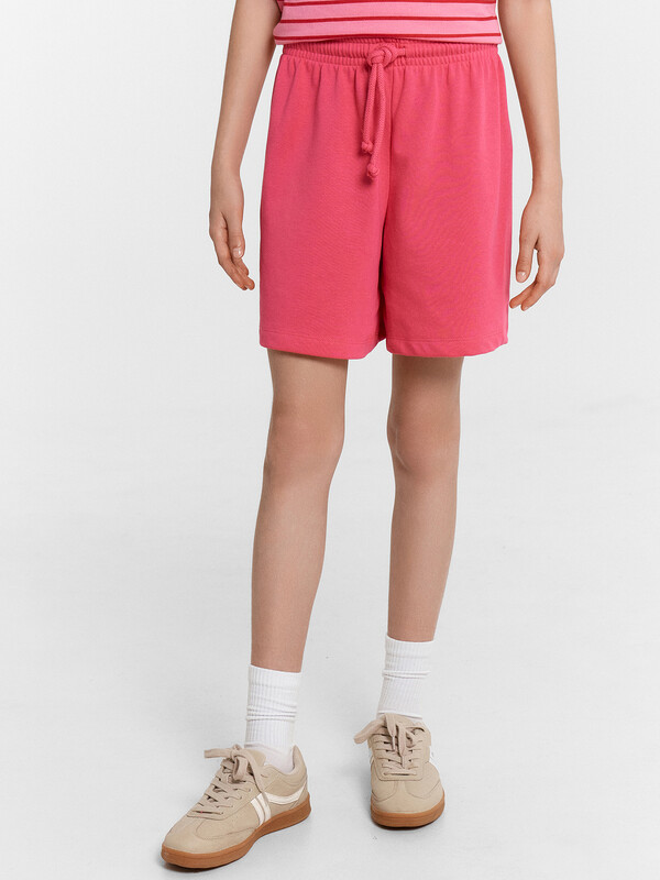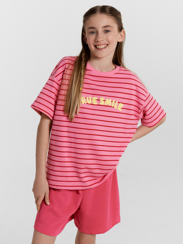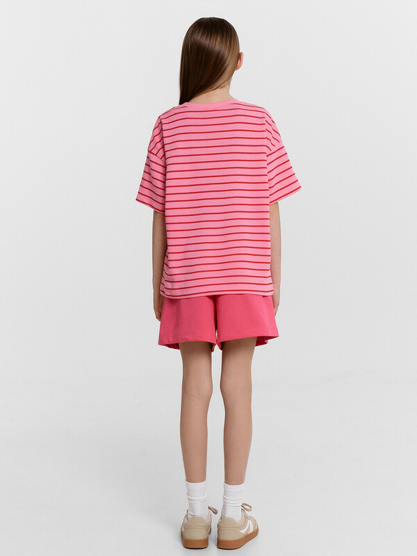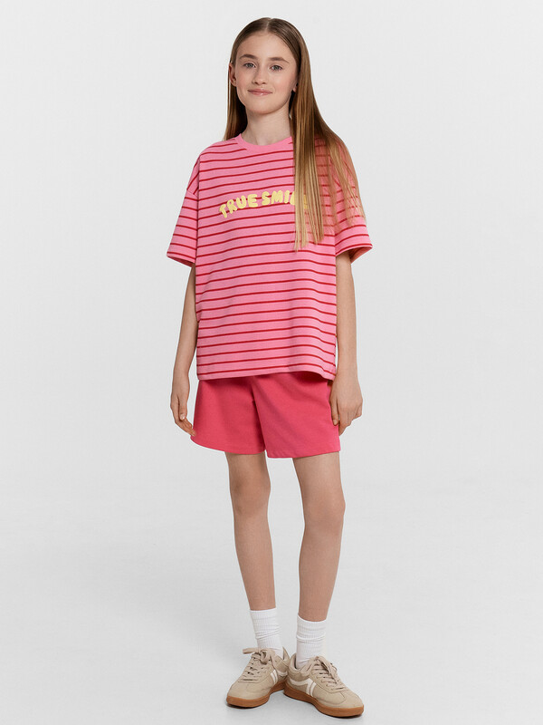 Стильный комплект для девочек. Выполнен из трикотажного футера. Состоит из футболки и шортов. Футболка свободного силуэта длиной до середины бедра, с короткими рукавами и круглой горловиной. Шорты длиной немного выше колен, с эластичной резиной в поясе и регулировочным шнуром. Прекрасный выбор!