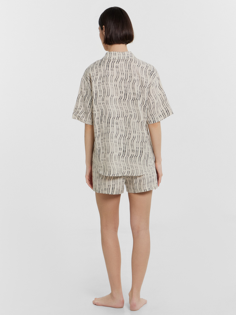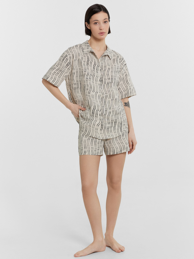 Комплект женский состоит из жакета и шорт. Жакет свободного силуэта, с воротником стойкой. Рукав втачной короткий, рукав обработан в подгибку. Жакет с центральной застежкой с петлями и пуговицами. Низ застрочен швом в подгибку. Шорты свободного силуэта, высокая посадка. Верх застрочен в подгибку с протянутым шнуром из основного полотна. В боковых швах карманы. Низ шорт обработан вподгибку.