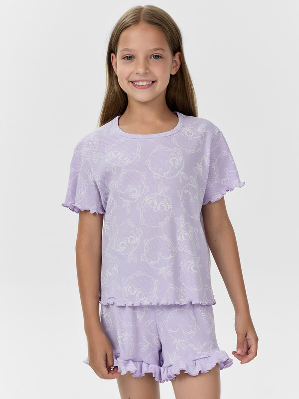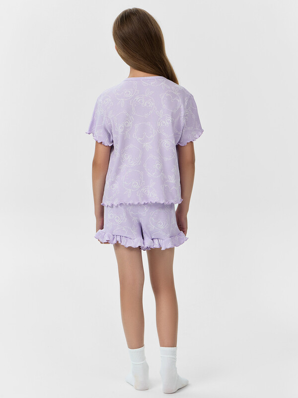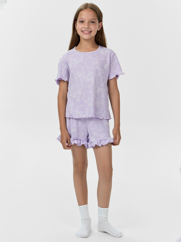 Комплект состоит из футболки и шорт. Футболка прямого силуэта. Перед и спинка цельнокроенные. Горловина круглая окантована бейкой из основного полотна. Низ рукавов и изделия обработаны микрооверлоком.
