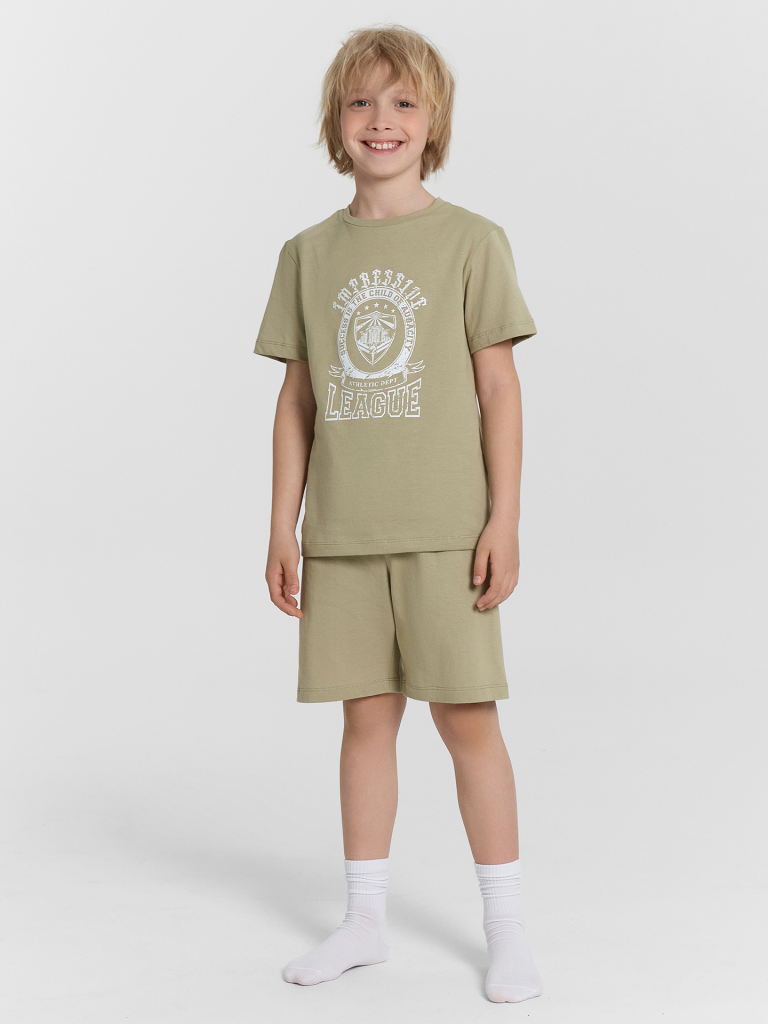 Пижама для мальчиков. Выполнена из хлопкового трикотажа кулирного переплетения. Комплект включает футболку и шорты. Футболка свободная, с круглой горловиной и короткими рукавами. Шорты длиной до колен, с эластичной тесьмой в поясе. Отличный комплект для сна и отдыха!