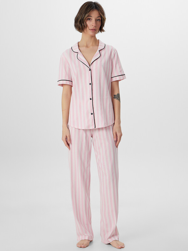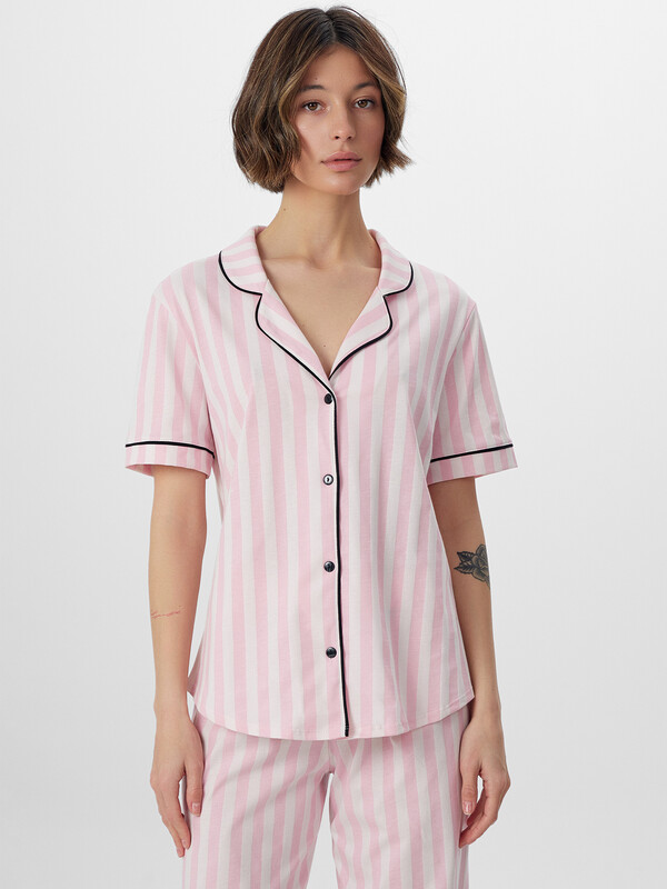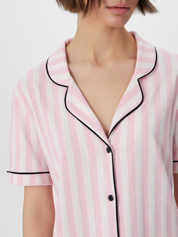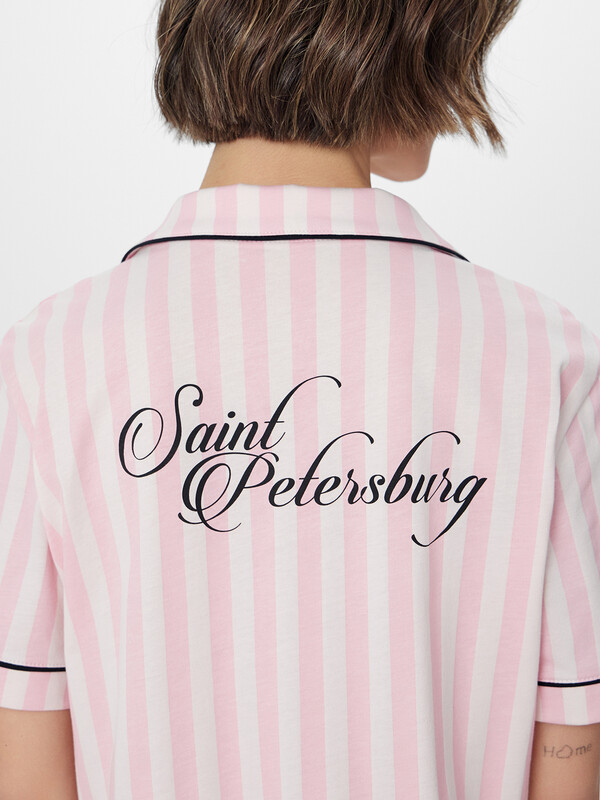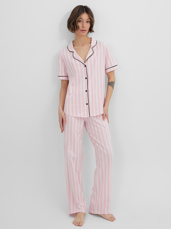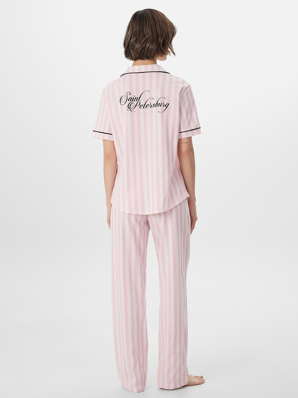 Комплект женский состоит из жакета и брюк. Жакет прямого силуэта, спинка цельнокроеная. Горловина оформлена отложным воротником с лацканами. Край борта и воротника оформлен кантом. Рукав втачной короткий, низ рукава обработан манжетой с втаченным кантом. Жакет с центральной застежкой с петлями и пуговицами. Низ застрочен швом в подгибку. Брюки с посадкой на талии свободного силуэта. Пояс цельнокроеный с резиной внутри. Низ брюу застрочен швом в подгибку
