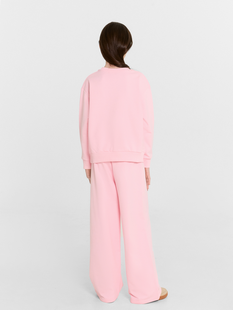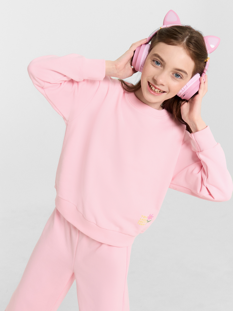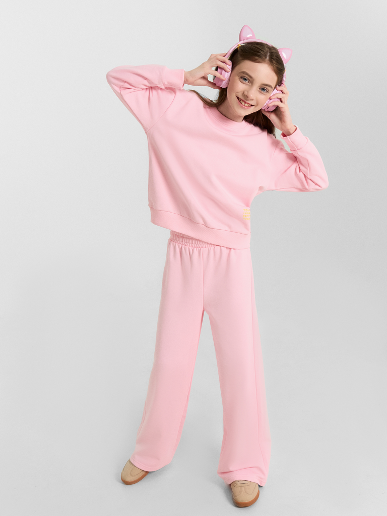 Комплект для девочек – удачное вложение в повседневный гардероб. Свитшот прямого силуэта с круглым вырезом горловины,длинными рукавами с эластичными манжетами и спущенной линией плеча. Брюки свободного силуэта с эластичным поясом обеспечивают удобную посадку и свободу движений. Изделие выполнено из прочного и износостойкого футера. Этот комплект станет отличным выбором для повседневной носки, позволяя каждой девочке чувствовать себя комфортно и стильно каждый день!