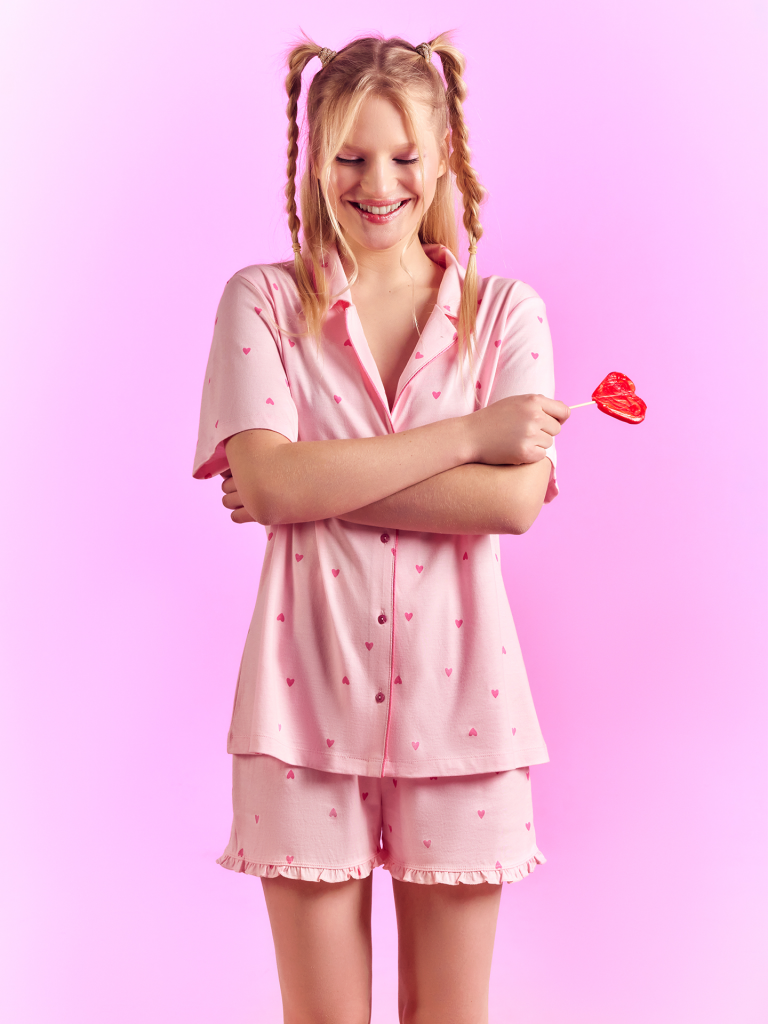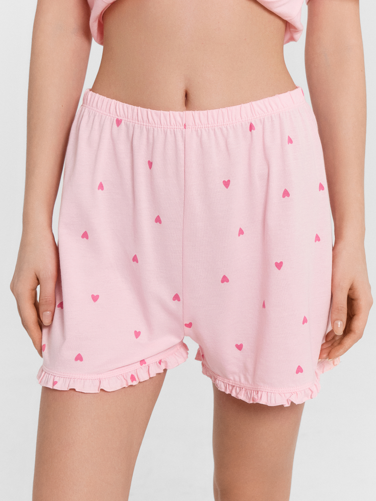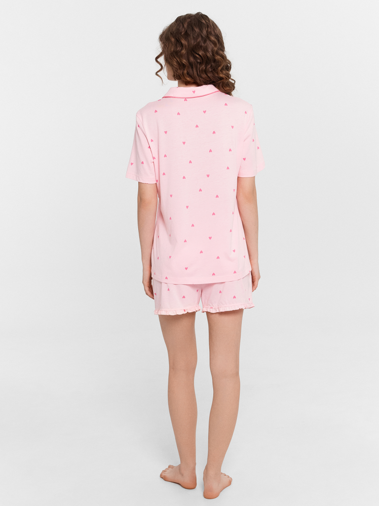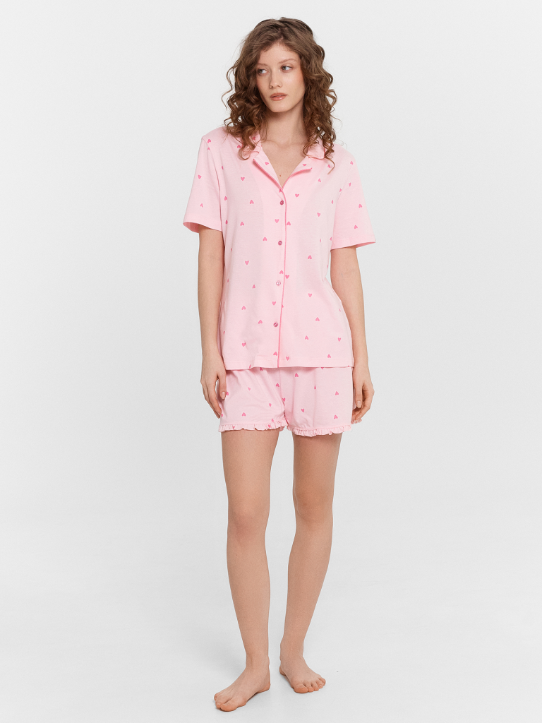 Красивая женская пижама свободного силуэта, выполненная из высококачественного хлопка, обеспечит комфорт и стильные домашние образы. Горловина рубашки оформлена отложным воротником с лацканами, по краю которого проходит атласный кант, добавляющий изысканности. Короткие рукава делают рубашку идеальной для теплой погоды, а центральная застежка с на пуговицах придает удобство и элегантность. Шорты свободного силуэта декорированы рюшами по низу, что добавляет им очарования и женственности. Материал из хлопка обеспечивает комфорт при носке, легкость и приятные ощущения на коже. Пижама абсолютно не жаркая, благодаря легкой и слегка тянущейся ткани, которая не сковывает движений. Эта красивая и интересная модель подойдет как для сна, так и для домашних дел. Если вы в поиске нескучного комплекта, эта пижама однозначно порадует вас. Прекрасный выбор для тех, кто ценит комфорт и стиль в каждой детали.