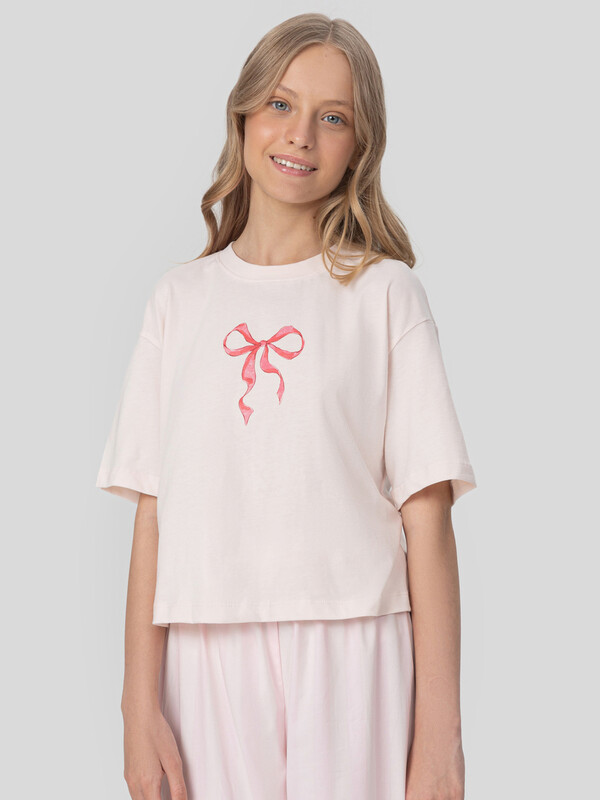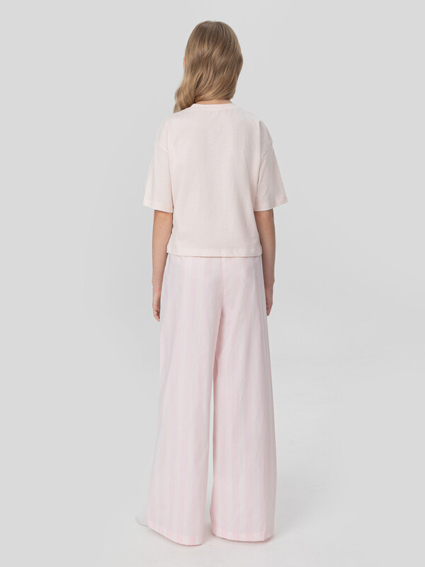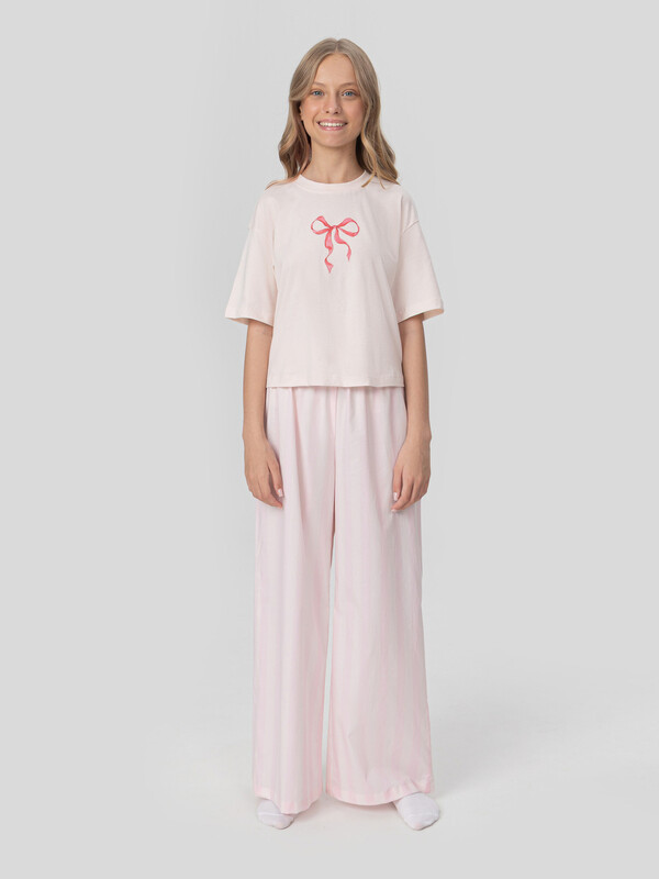 Домашний комплект для девочек: комфорт, которому можно доверять. Свободная футболка из мягкого хлопкового материала — легкая, дышащая и не сковывает движения. Круглая горловина с эластичной обтачкой из рибаны бережно облегает шею, а слегка спущенная линия плеча добавляет образу легкую расслабленность. Подгибка на рукавах и по низу — аккуратная и практичная отделка. Брюки свободного силуэта с эластичным поясом легко адаптируются к фигуре, не создавая давления и дискомфорта. Низ брюк в подгибку придает завершенность образу. Натуральный хлопок делает комплект идеальным для отдыха дома, игр и сладкого сна.
