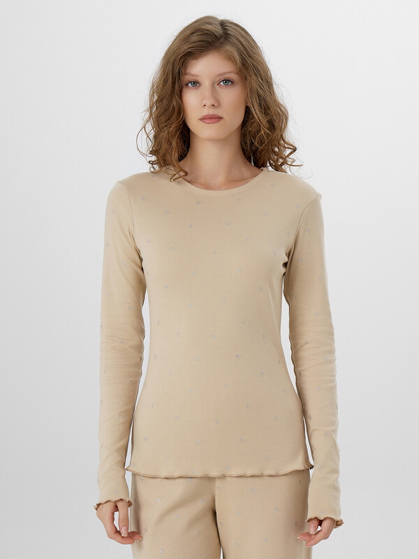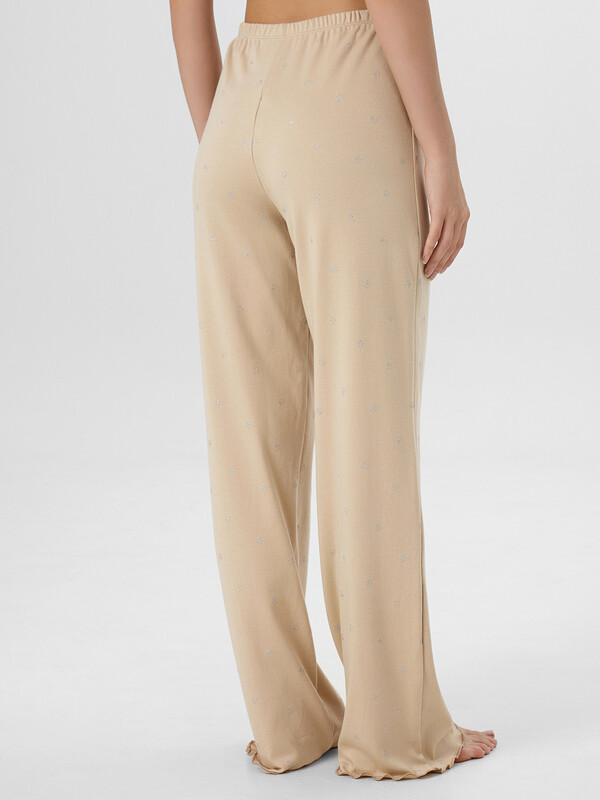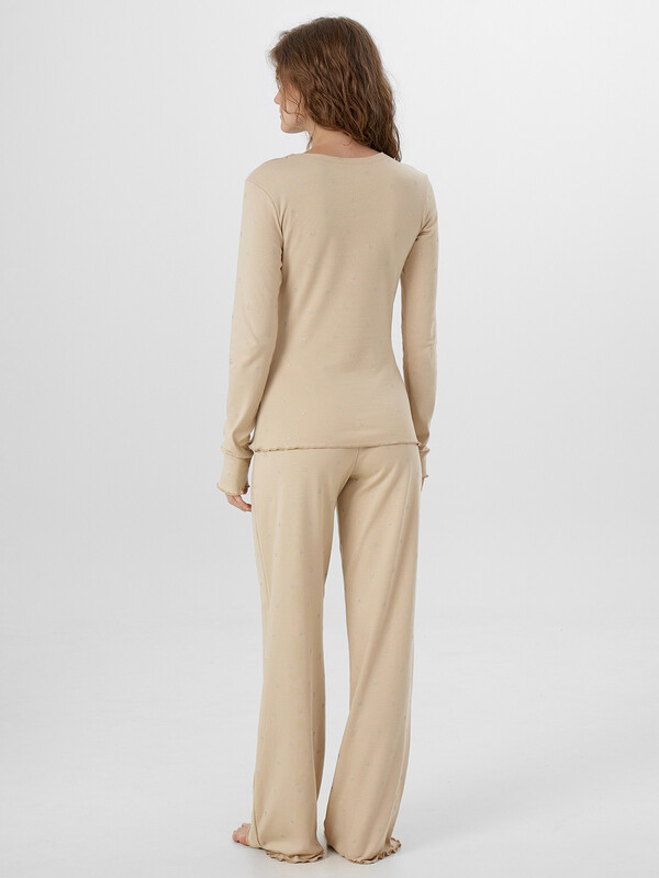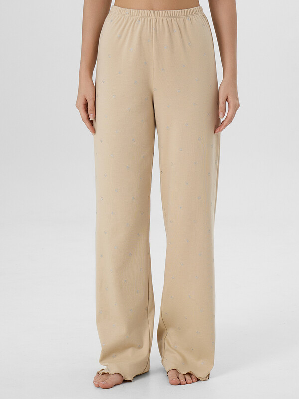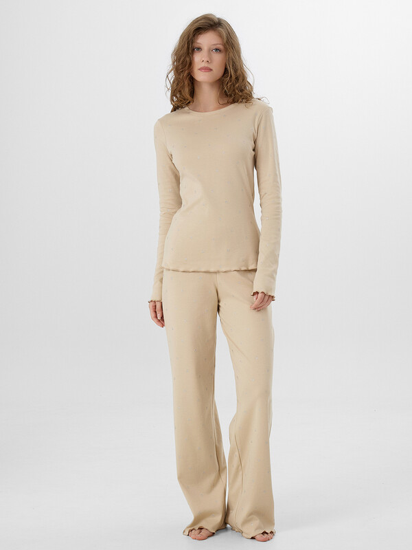 Джемпер свободного силуэта, чуть приталенный. Перед и спинка цельнокроеные. Горловина овальной формы, обработана в подгибку. Рукава втачные, длинные. Низ изделия и рукавов обработаны на микрооверлоке. Брюки свободного силуэта, с посадкой на талии. Пояс цельнокроеный с эластичной тесьмой внутри (внутр. 20мм 20 RV). Низ брюк обработан на микрооверлоке.
