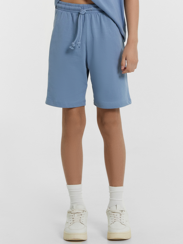 Шорты выполнены из трикотажного кулирного полотна. Шорты длиной до колен. На передних половинках обработаны карманы с отрезным бочком.