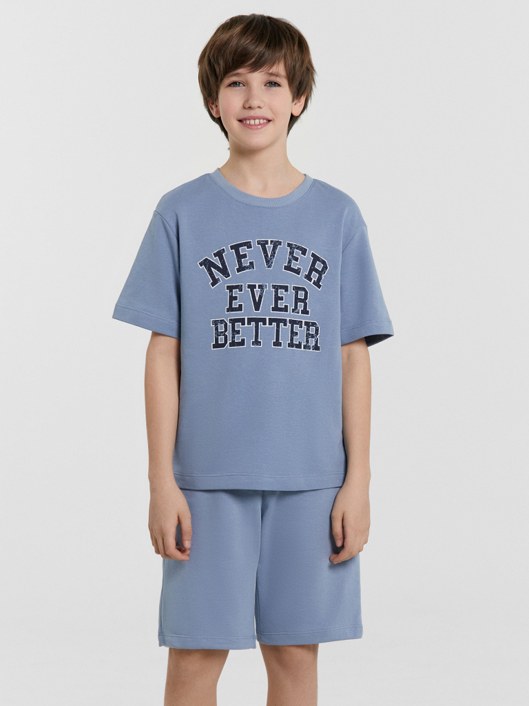 Стильный комплект для мальчиков. Изготовлен из трикотажного футера. Футболка свободного силуэта, длиной до середины бедер, с короткими рукавами и круглой горловиной. Шорты длиной до колена, с эластичной резиной в поясе и регулировочным шнурком. Отличный выбор!