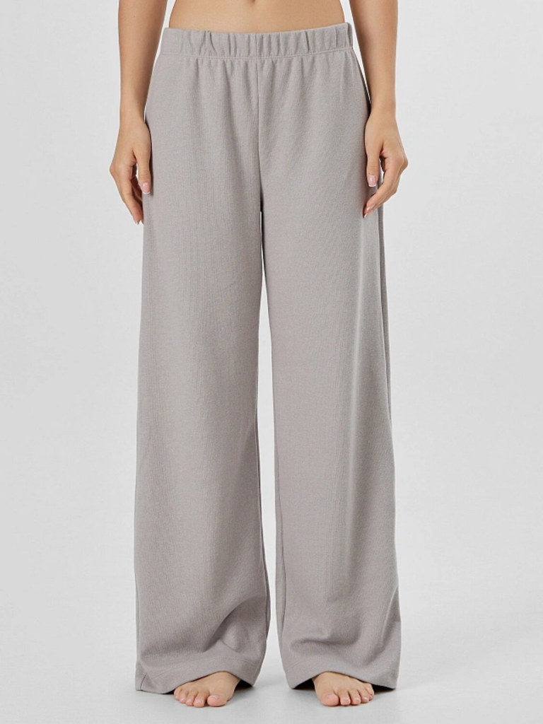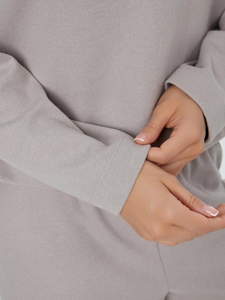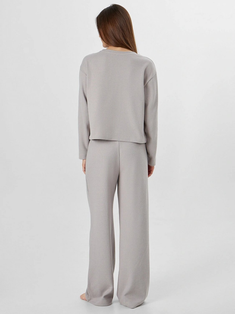 Комплект женский состоит из джемпера (502872) и брюк (532253). Джемпер домашний женский прямого силуэта. Горловина круглой формы, обтачка из основного полотна. Плечо слегка спущено. Рукав втачной, длинный. Нижний срез джемпера обработан швом вподгибку. Брюки с посадкой на талии, свободного силуэта. Пояс цельнокроеный с эластичной тесьмой внутри (внутр. 40мм 40RV). Нижний срез обработан швом в подгибку.