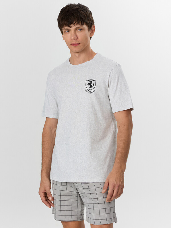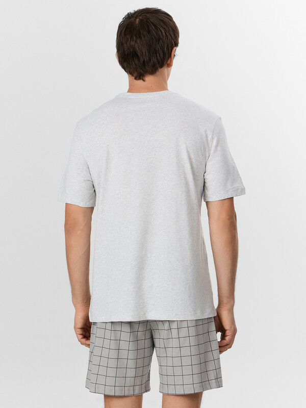 Футболка прямого силуэта с округлой горловиной, обработанной эластичной рибаной, плотно прилегает, не деформируясь при носке. Шов на спинке аккуратно закрыт, а нижние срезы и рукава подогнуты для долговечности. Шорты свободного кроя длиной выше колена не сковывают движения. Цельнокроеный пояс с эластичной тесьмой внутри мягко фиксируется на талии, а боковые карманы добавляют практичности.