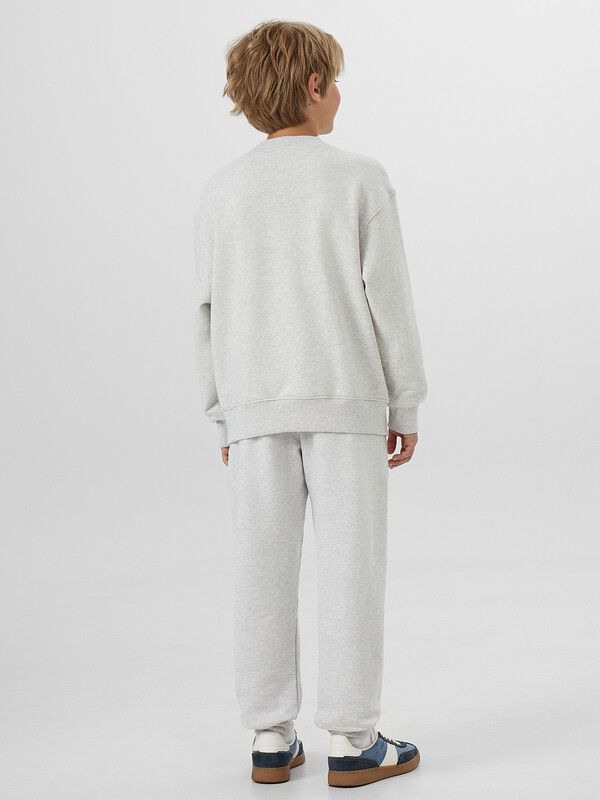 Свитшот прямого силуэта для мальчиков. Горловина округлой формы. Плечо слегка спущено, рукав втачной длинный. По низу рукава отрезная манжета из рибаны. Пояс отрезной из рибаны, отстрочен. Брюки для мальчиков. Без бокового шва. Карманы в вытачке. Пояс отрезной с внутренней эластичной тесьмой 50RV. Пояс прострочен двумя отделочными строчками. Внутри в пояс втянут шнур. Низ брюк обработан манжетами из рибаны.